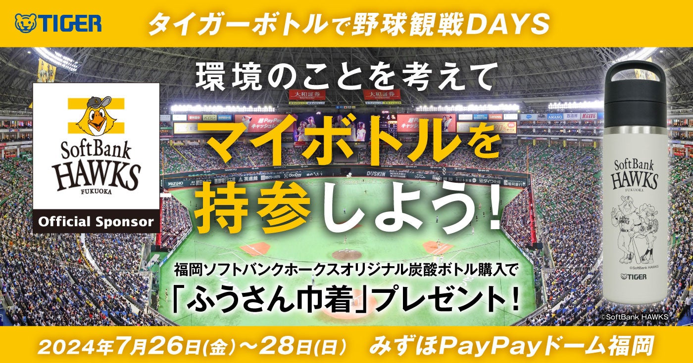 熱制御テクノロジーで世界をリードするタイガー魔法瓶株式会社(社長:菊池嘉聡、本社:大阪府門真市)は、福岡ソフトバンクホークスとコラボレーションし、マイボトルを持参してスポーツ観戦を楽しむスタイルを推奨する「タイガーボトルで野球観戦DAYS~環境のことを考えてマイボトルを持参しよう~」を 7月26日(金)~28日(日)にみずほPayPayドーム福岡で行われる3連戦にて、開催いたします。