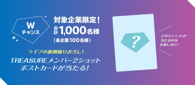さらに、対象企業限定のWチャンスとして、対象となる企業で購入したレシートで応募すると合計1,000名様(各企業100名様)に、ライブの裏側撮りおろし!TREASUREメンバー2ショットポストカードが当たります。