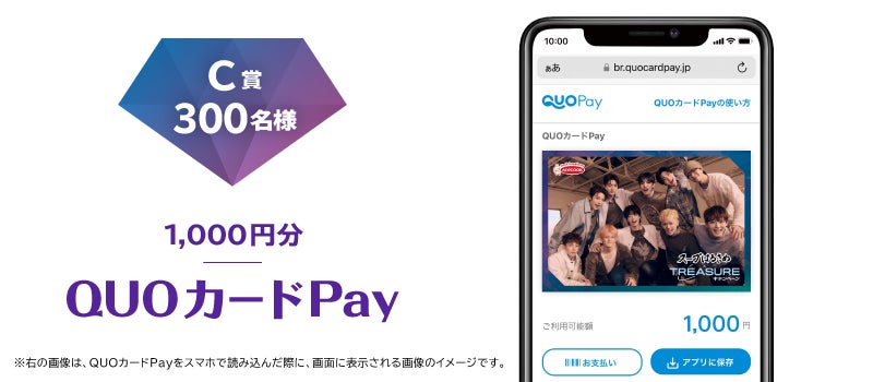 株式会社クオカード(以下当社、本社:東京都中央区、代表取締役社長:近田 剛)が展開するスマートフォンで使えるデジタルギフト「QUOカードPay(クオ・カード ペイ)」は、エースコック株式会社が「TREASURE」とコラボして開催する「スープはるさめ×TREASUREキャンペーン」で採用されました。本キャンペーンでは、期間中に対象商品を3個以上購入したレシートで応募すると、抽選でTREASUREデザインのQUOカードPayなど豪華賞品がプレゼントされます。