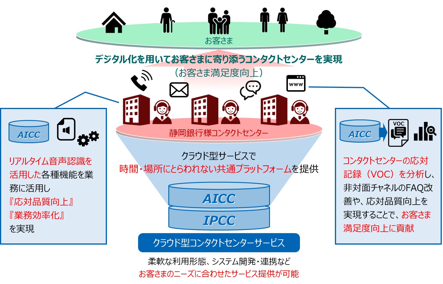 西日本電信電話株式会社 静岡支店(支店長:番匠 俊行/以下、NTT西日本)およびNTTビジネスソリューションズ株式会社(代表取締役社長:上原 一郎/以下、NTTビジネスソリューションズ)は、NTTグループの「ONE CONTACT」※1のコンセプトに基づき、顧客接点に集まるリアルな情報から、新たな価値を生み出す企業活動を支えるソリューションを展開しております。金融業界では急速に非対面での取引が活性化しており、新たな顧客接点の基盤としてNTTビジネスソリューションズが提供する「ONE CONTACT Network」※2のクラウド型基盤サービスであるAQStageIPコールセンタサービス※3(以下IPCC)及びAIコミュニケーションセンターサービス※4(以下AICC)を株式会社静岡銀行様(取締役頭取:柴田 久/以下、静岡銀行)に採用いただくこととなりました。