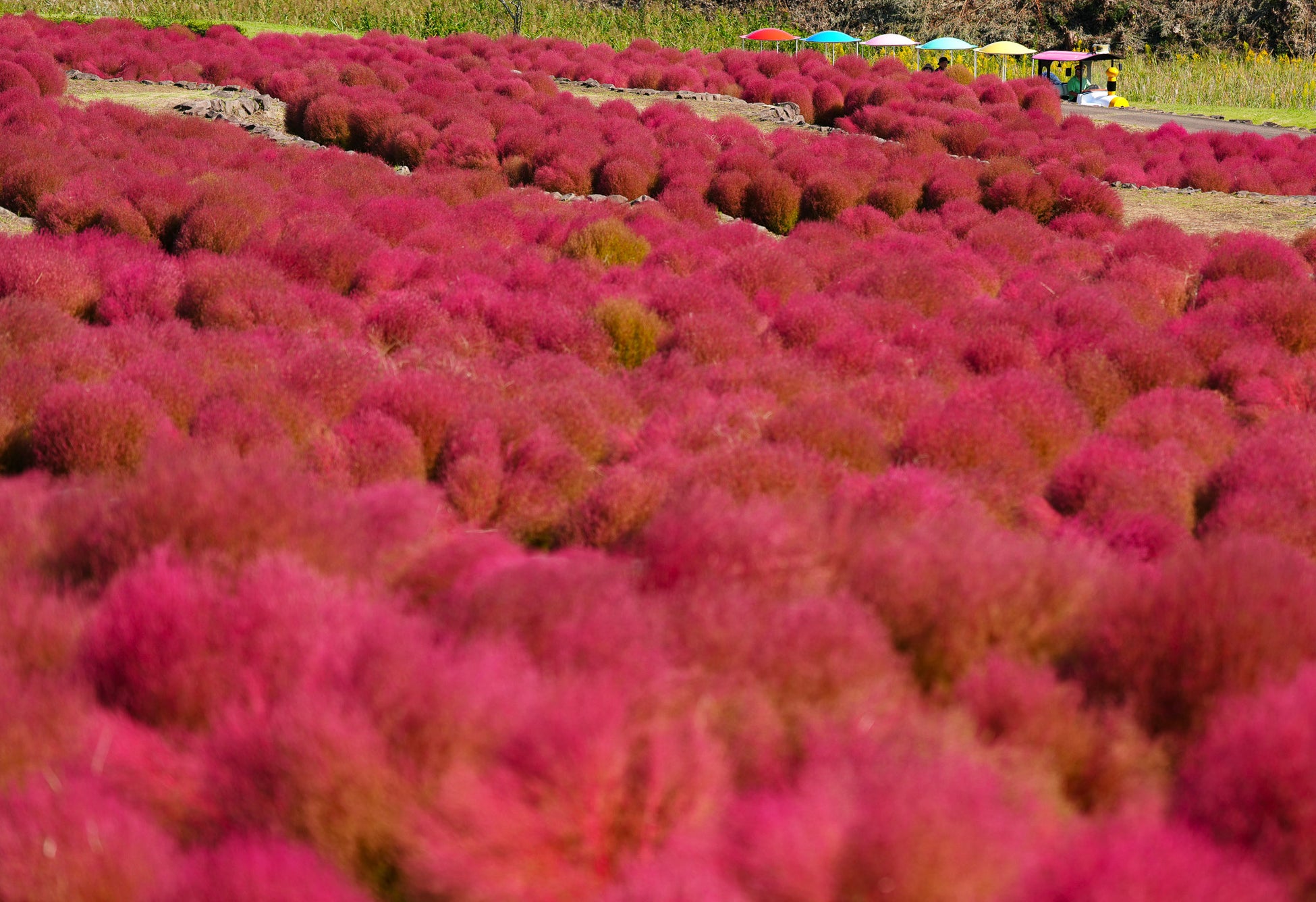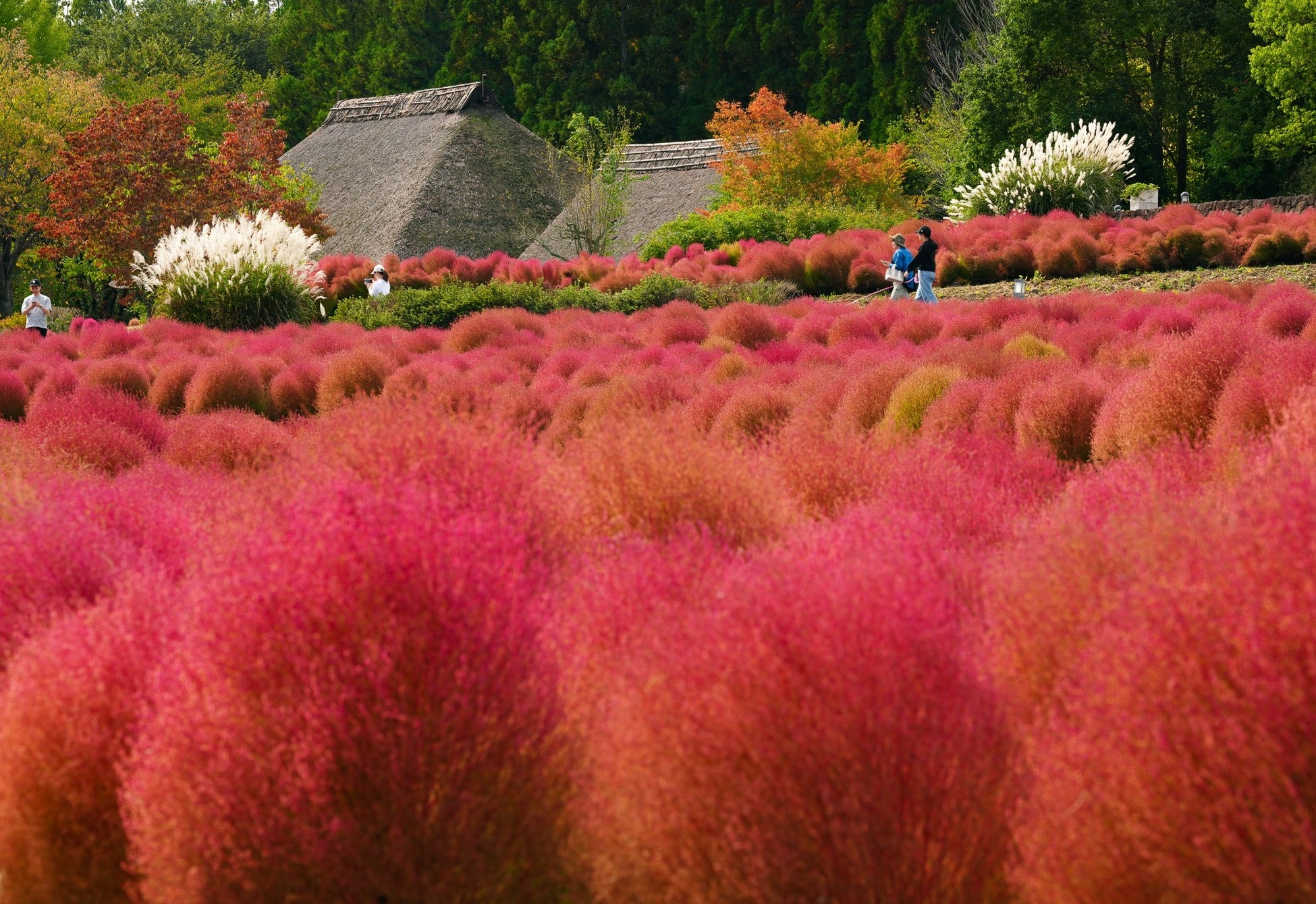 国営みちのく杜の湖畔公園(宮城県柴田郡川崎町)では、合計7,000本のコキアが真っ赤に染まり、秋の風景が広がっています。