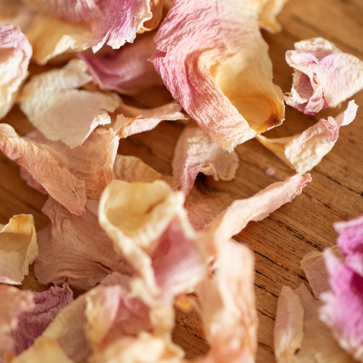 芍薬の花びらのドライフラワーと、マルチな用途に使えるフレグランスオイル(20mL)のキット。ドライフラワーに使用している芍薬の花は、まだ美しいのに廃棄されてしまう花を救う活動をされている、株式会社RINさんからいただいたロスフラワー®を活用しています。ピンクや紫などの愛らしい花びらにフレグランスオイルを垂らして、目でも香りでもピーチピオニーをお楽しみください。