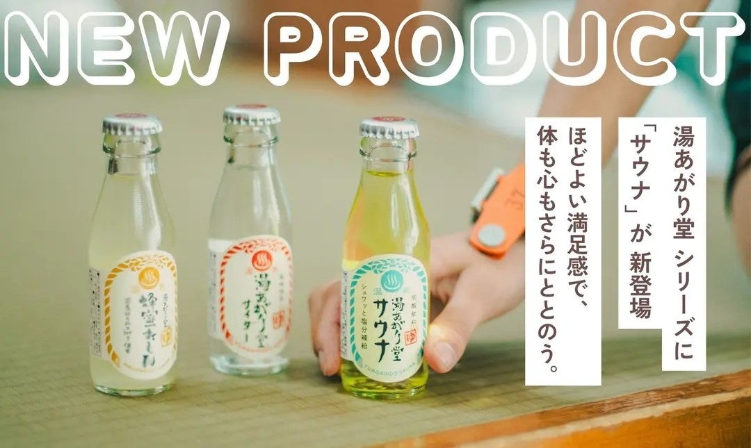 「湯あがり堂サウナ」は飲みきりサイズの炭酸飲料。エナジードリンク風味にほんのり塩味が効いており、サウナ後の“ととのう”をサポートします。