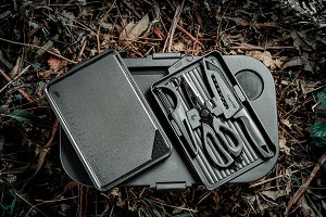 まな板、調理用ナイフ、キッチンバサミ、ピーラーの4点セット。コンパクトに収納可能な設計で、軽量で持ち運びに便利なことも特徴です。