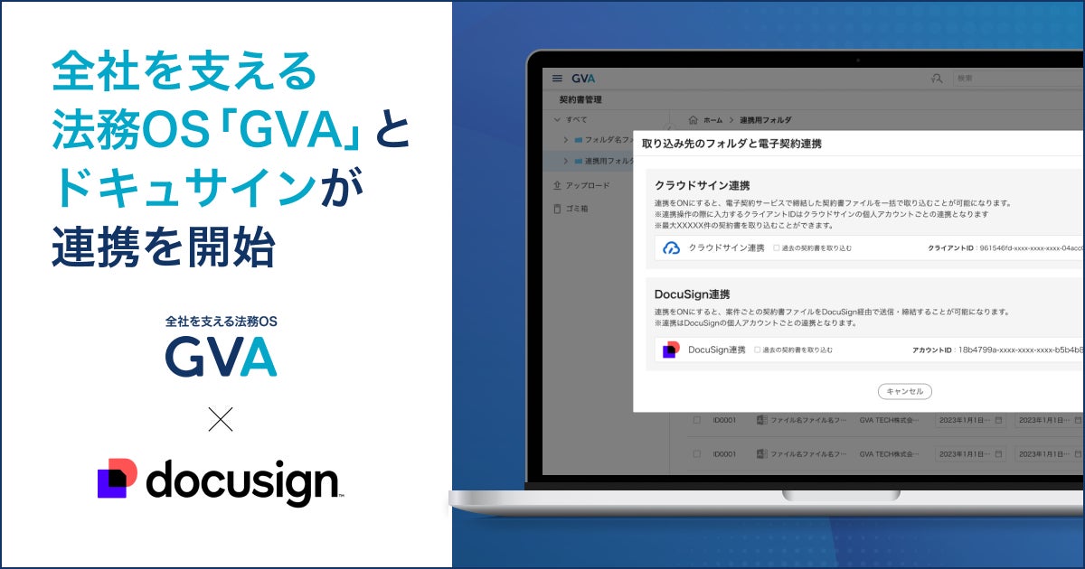 GVA TECH株式会社(本社:東京都渋谷区、代表取締役:山本 俊、以下GVA TECH)は、『全社を支える法務OS「GVA」』のモジュールの一つである生成AIを活用した契約管理機能が、クラウド上で電子契約を行う「ドキュサイン」との連携を開始したことをお知らせいたします。