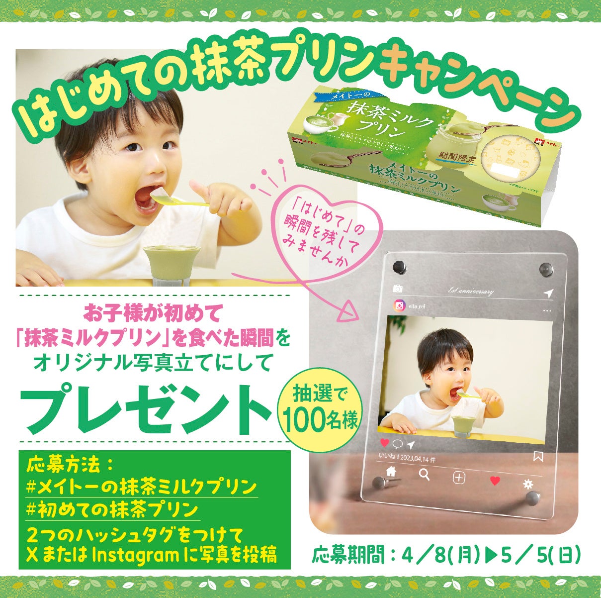 メイトーの抹茶ミルクプリンで “抹茶デビュー”したお子様を撮影した写真をSNSに投稿してくれた方の中から、抽選で100名様に写真を入れたオリジナル写真立てをプレゼントいたします。