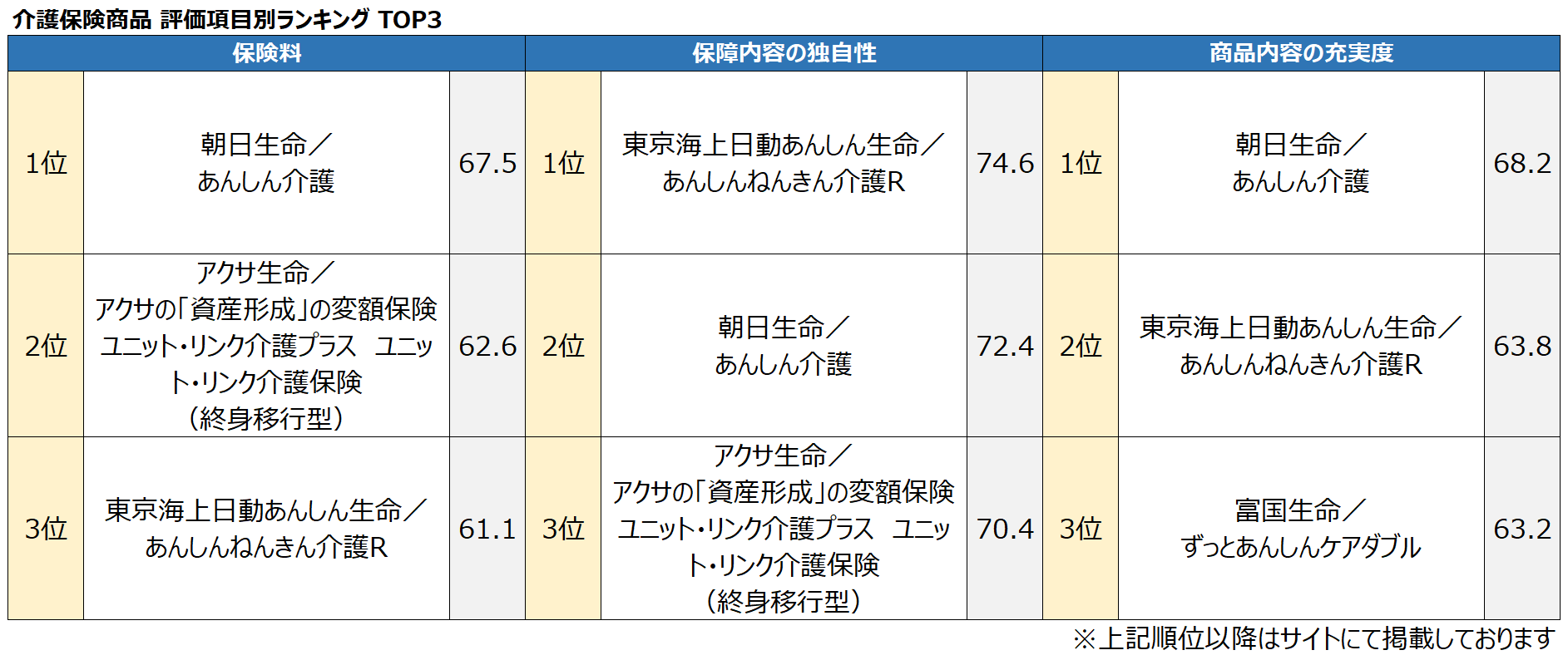 今回総合1位となったのは【朝日生命/あんしん介護】。評価項目別ランキングでは「保険料」「商品内容の充実度」で1位となりました。