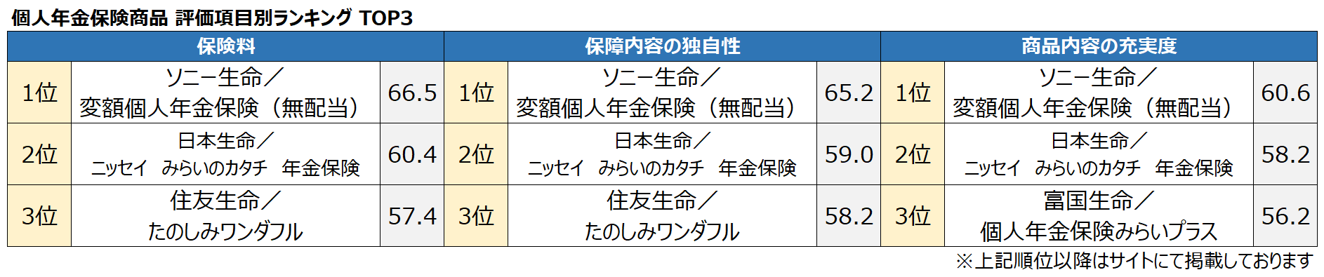 今回総合1位となったのは【ソニー生命/変額個人年金保険(無配当)】。評価項目別ランキングでは「保険料」「保障内容の独自性」「商品内容の充実度」のすべてで1位となりました。