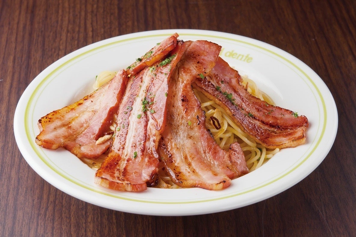 ジューシーな厚切りベーコンをどどんと4枚も乗せたペペロンチーノ。にんにくの香りと、ほどよいオイル感のスパゲッティが食欲をそそります。