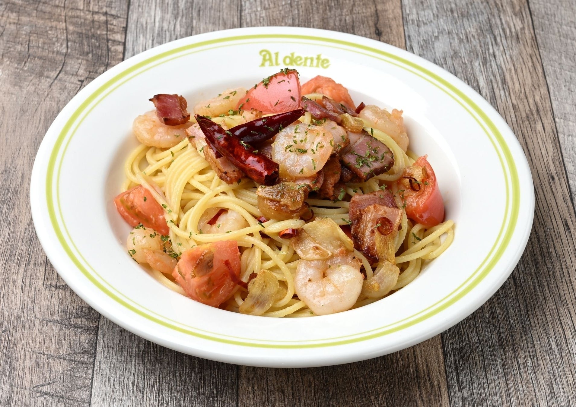 エビとベーコン、トマトの旨味が溶け込んだオイルベースのパスタです。