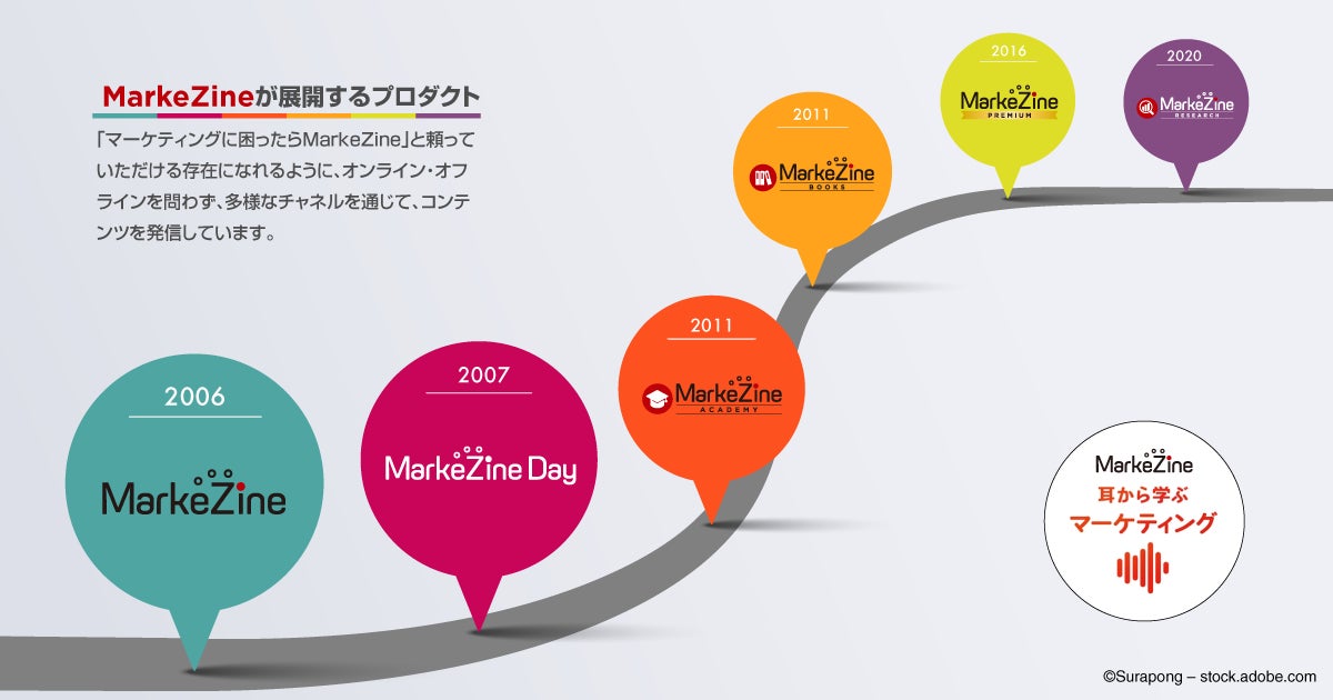 また、MarkeZineが展開する各プロダクトのロゴも、統一感を持たせて刷新しました。Webメディアだけでなく、カンファレンスや教育講座、有料会員向けサービス、書籍シリーズ、調査事業、音声コンテンツなど、読者の方々の様々な課題や期待に沿えるように、多様なチャネルを用意しています。