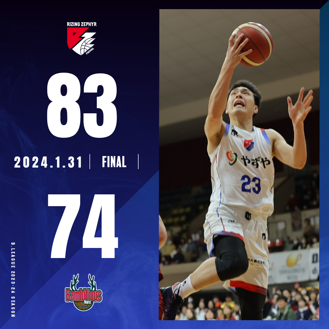2024年1月31日(水)に開催されました【ライジングゼファーフクオカvs.バンビシャス奈良】において“福岡83-74奈良”の結果となりましたことお知らせいたします。