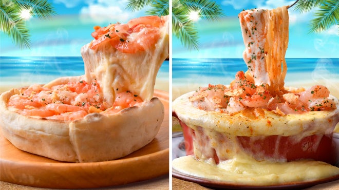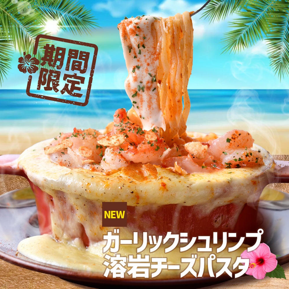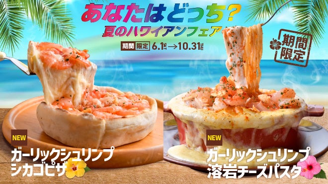 SNSで話題の「シカゴピザ」&「溶岩チーズパスタ」に、ハワイの名物料理「ガーリックシュリンプ」を組み合わせた、『ガーリックシュリンプシカゴピザ』と『ガーリックシュリンプ溶岩チーズパスタ』が夏限定で新登場!