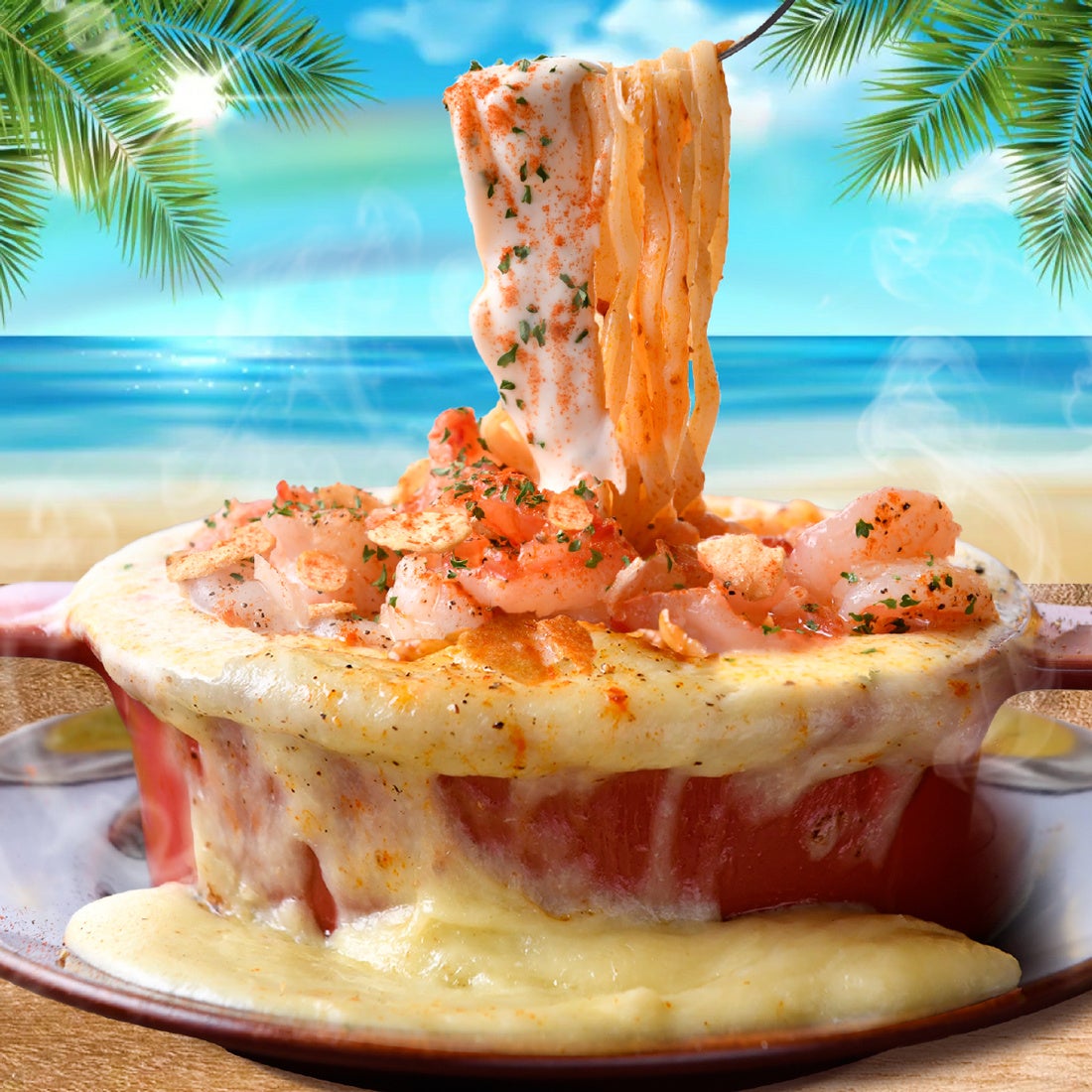 プリップリのエビの旨味と香ばしいガーリックの風味が口いっぱいに広がる贅沢なシカゴピザ&溶岩チーズパスタ。ひとくち食べれば、たちまち常夏ハワイへお連れします!