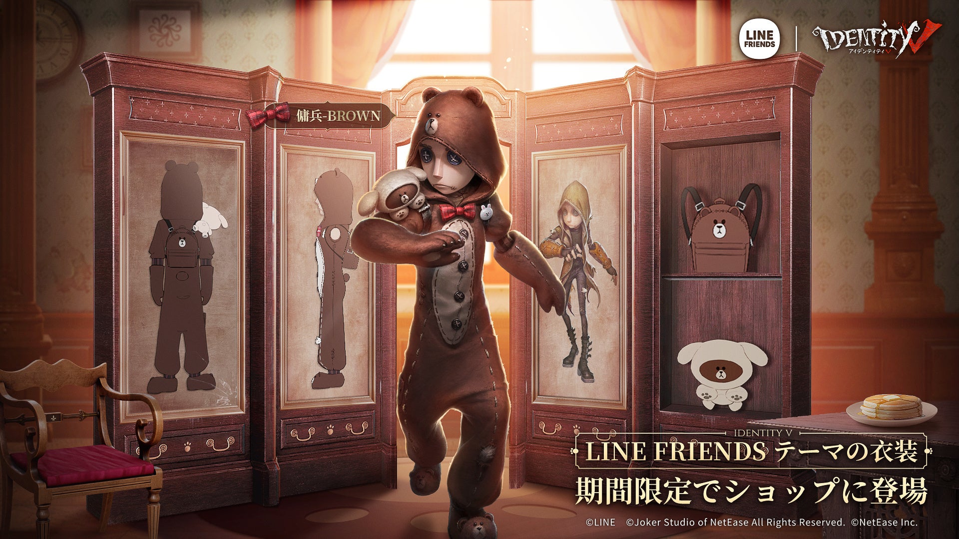 萌えに包まれた荘園は面白さ無限大。NetEase Games初の1v4非対称対戦型モバイルゲーム『Identity V』とLINE FRIENDSによる特別イベントが開催され、12月30日よりLINE FRIENDSのBROWNたちが荘園に登場します。とても可愛い見た目と際立つ個性を持ったゲストたち。彼らと謎に包まれた荘園がぶつかり合った時、どのような火花が飛び散るのでしょうか?一緒にこの盛大な宴に参加しましょう!