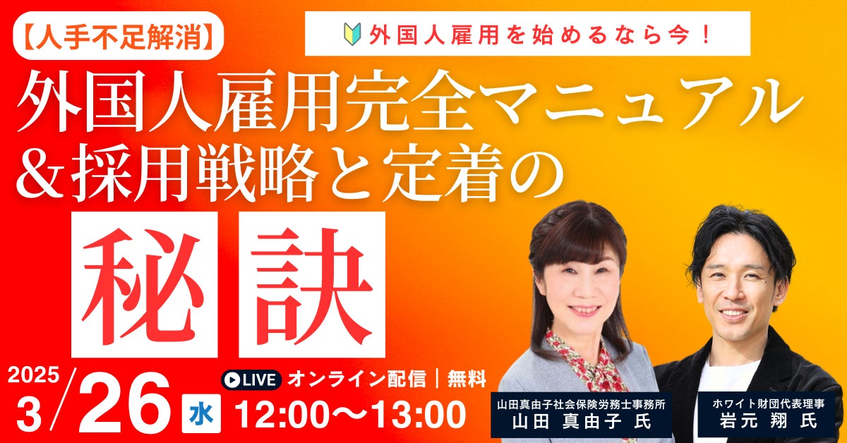 ホワイト企業認定を展開する一般財団法人 日本次世代企業普及機構(本部:大阪市北区、代表理事:岩元翔)は、山田真由子社会保険労務士事務所 代表 山田 真由子氏とともに【人手不足解消】外国人雇用完全マニュアル&採用戦略と定着の秘訣についての無料ウェビナーを開催します。