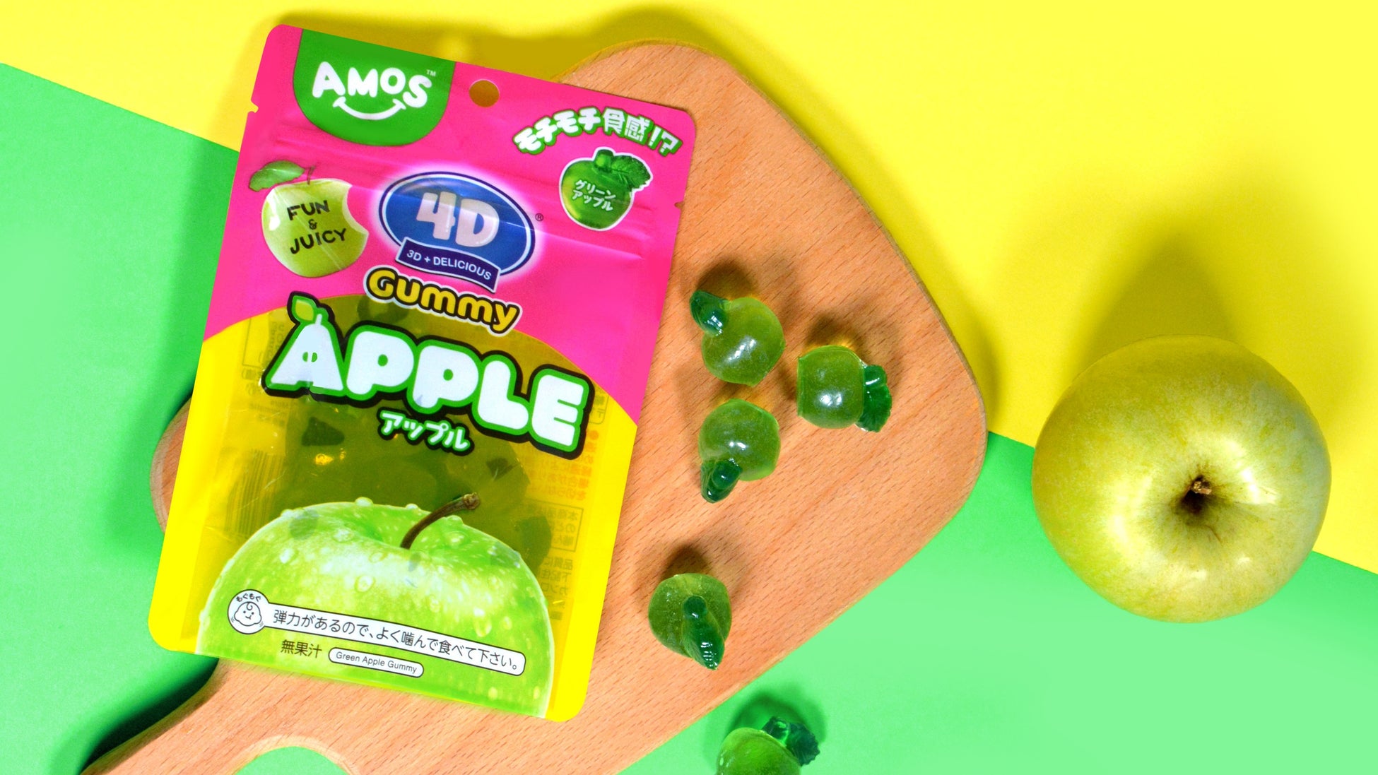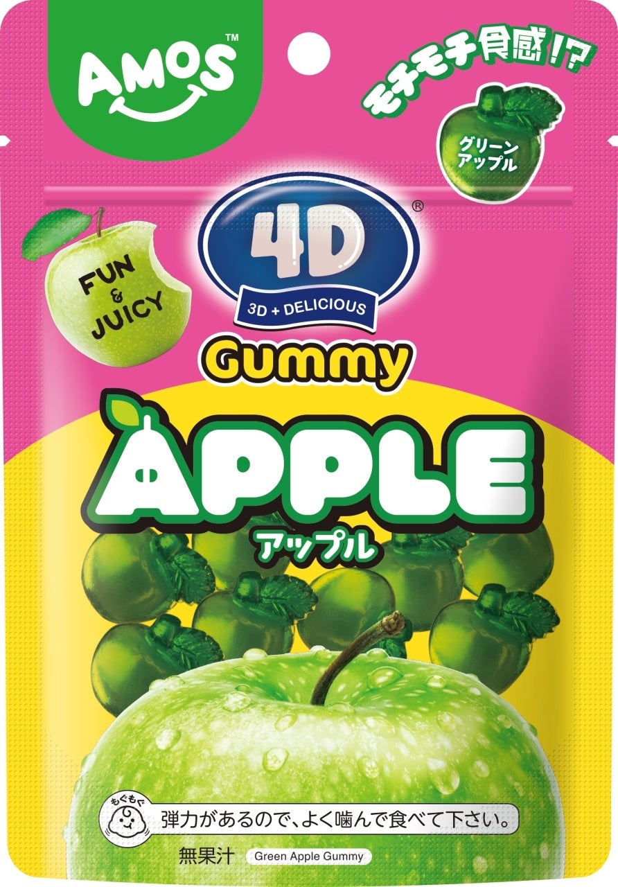 「4Dグミ アップル」は、立体的なりんご型のグリーンアップルグミで、同商品は、シリーズの中でも最大級の大きさである8gのグミを採用。「4Dグミ」でしか味わえない”もちもち食感”が、これまで以上に楽しめる商品となっています。また、大きく透明窓をあけることで、4Dグミならではの型の精巧さとインパクトが伝わるパッケージデザインにすることで、宝石のようなキラキラ感を外からも楽しめる商品となっています。原材料にもこだわり、合成着色料不使用で日本人の味覚にも合う味わいを追求しました。素材やおいしさにこだわるカンロと、精巧なグミの形を再現できる技術力で世界中に知られるAmos社、お互いの長所が融合した商品となっております。