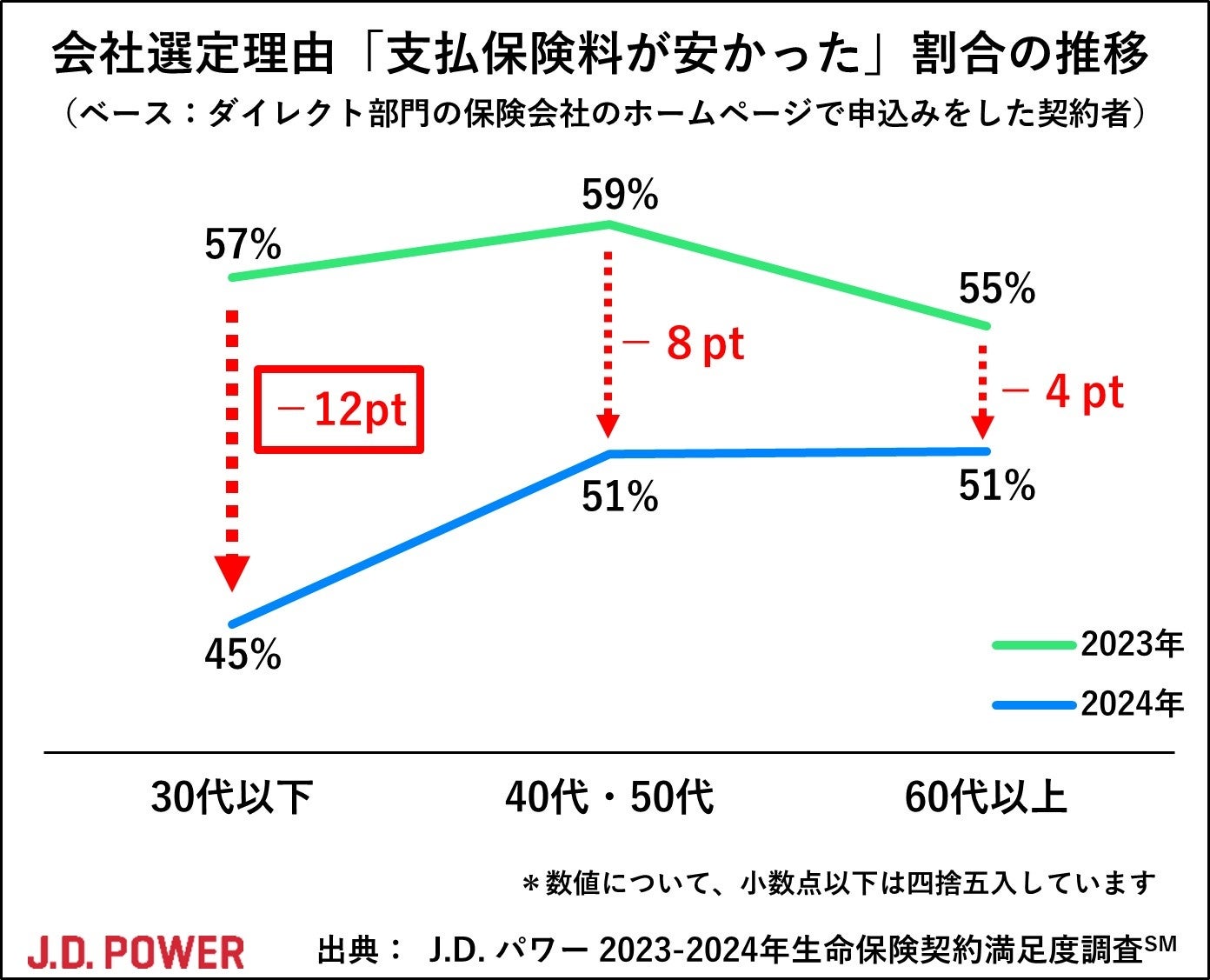 ダイレクト部門は、郵送(通信販売)とホームページ(オンライン契約)による申込みをした契約者を対象にしているが、その中で、ホームページ(オンライン契約)で加入した保険会社の選定理由に変化が見られた。ホームページ(オンライン契約)で加入した保険会社の選定理由トップは「支払保険料が安かった」であるが、前年から比較して9ptの低下が見られる。この変化は年代別で見るとより顕著で、30代以下では-12ptとなっている。