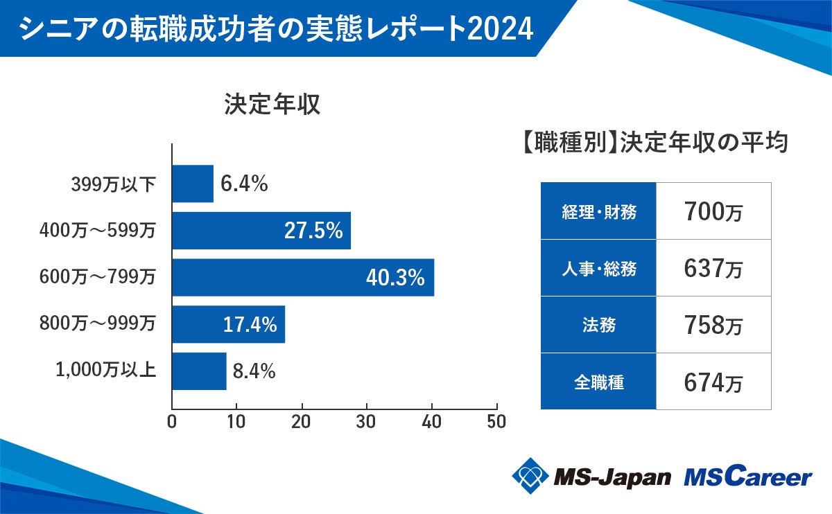 シニアの転職成功者に関する本調査にて、決定年収は平均674万円で、ボリュームゾーンは「600万~799万」で40.3%を占めることが明らかに。