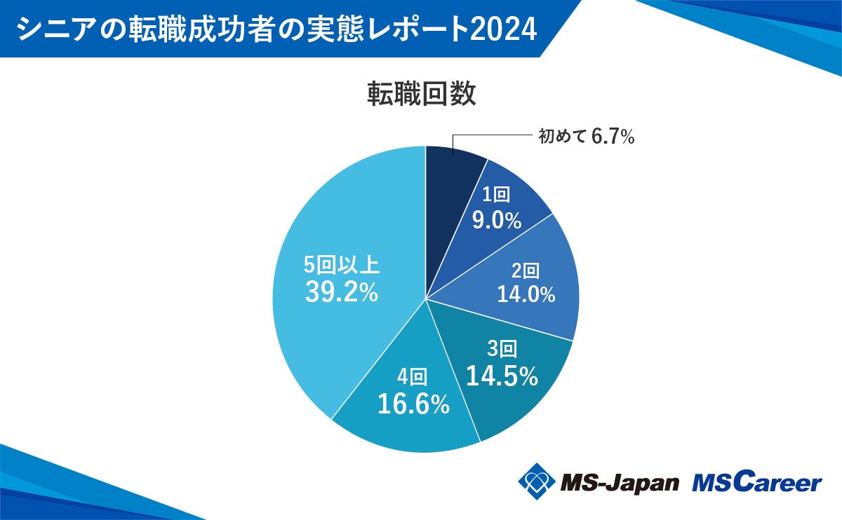 転職回数に関する調査では、過去「5回以上」転職をしたことがある方が39.2%を占め、最多に。一方「過去一度も転職を経験したことがない」方は6.7%にとどまり、シニアの9割が過去に転職を経験済みであることが明らかになりました。