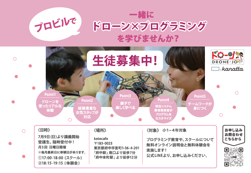 【7月開催】親子で楽しめる「kotocafe」で「ドローン×プログラミング体験会」を開催【ドローンジョプラス】