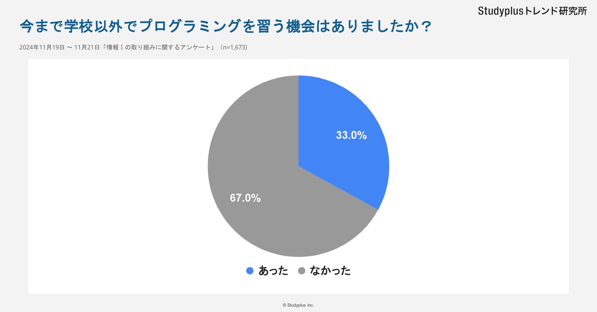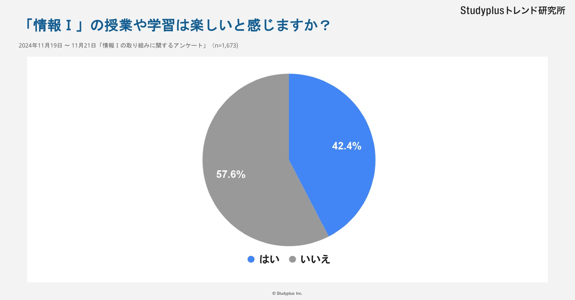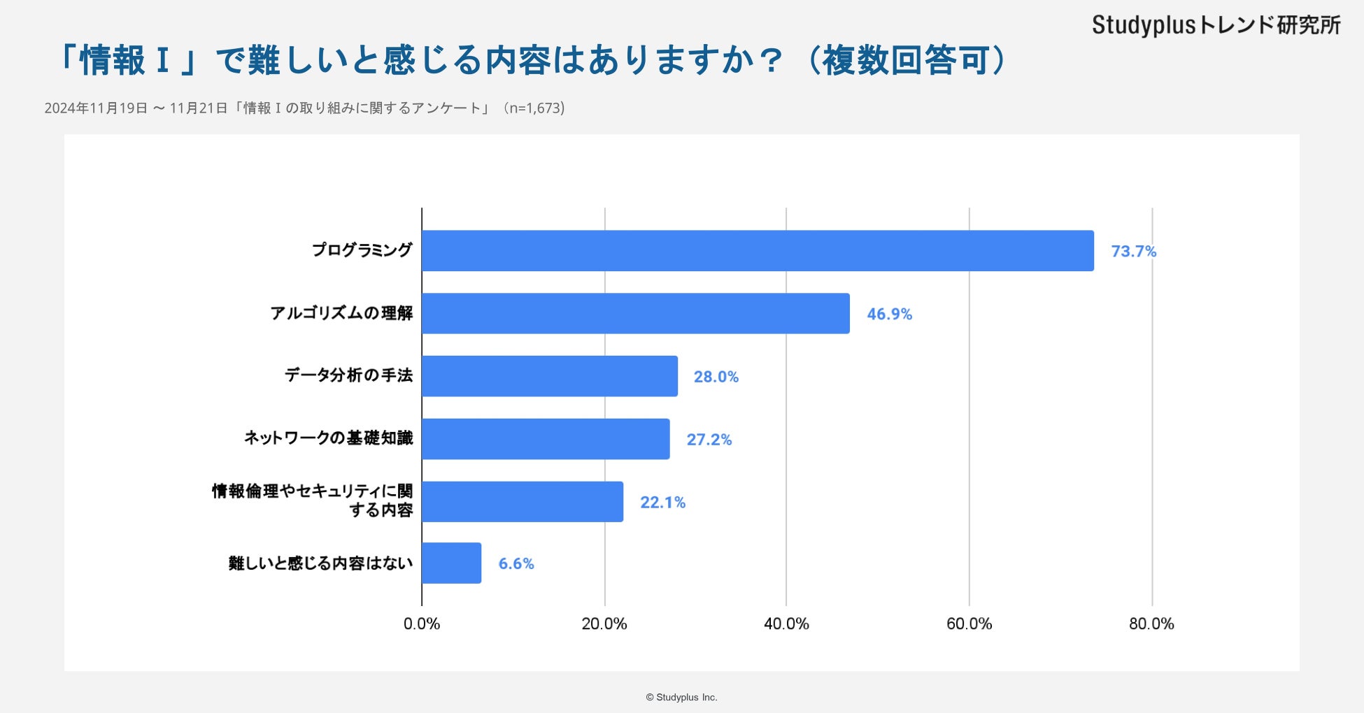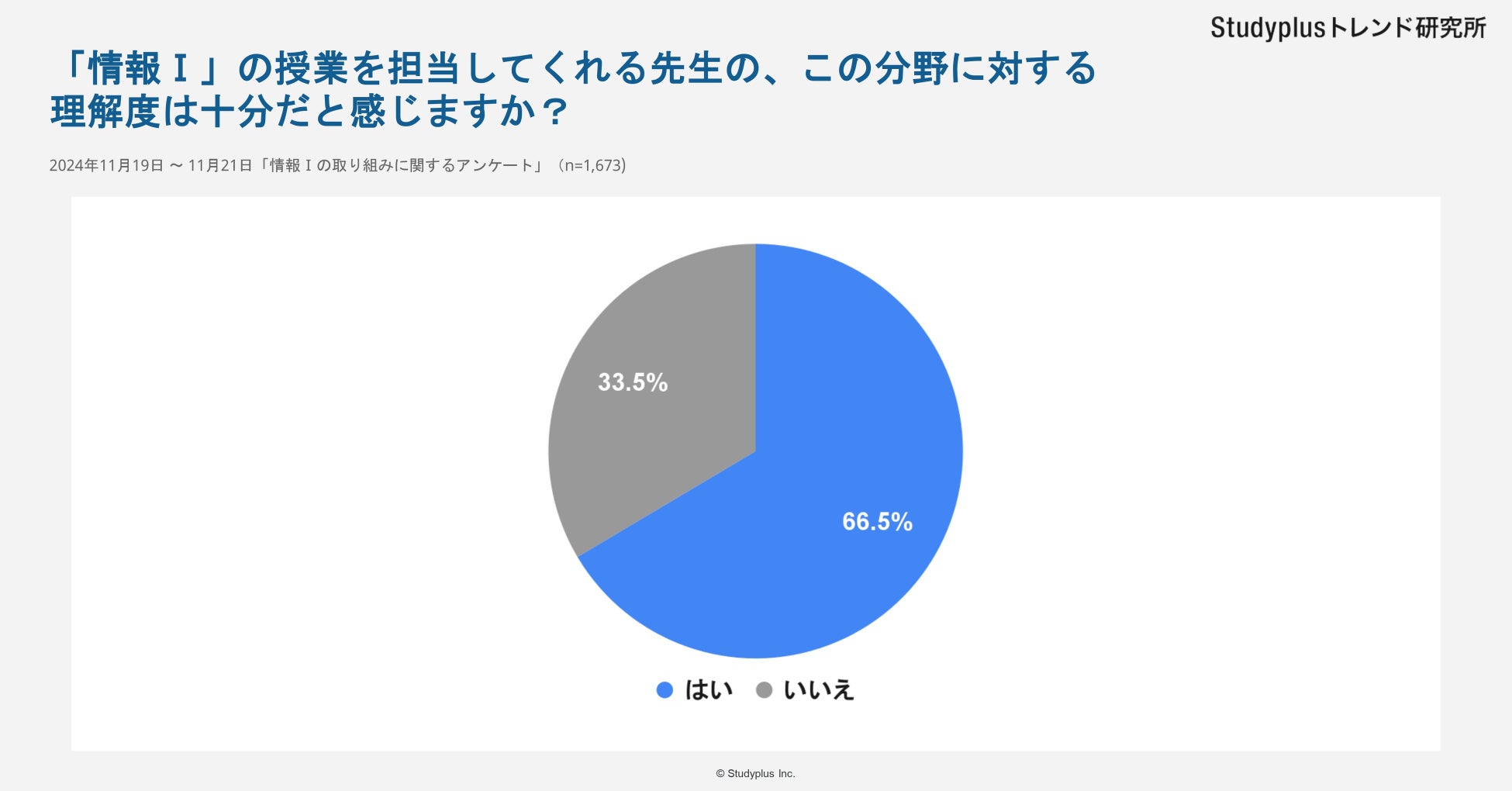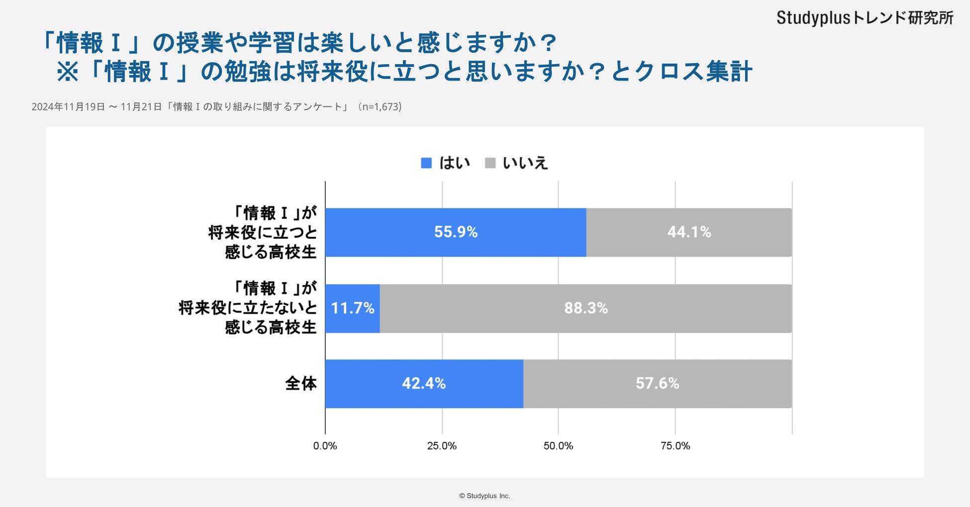 スタディプラス株式会社(本社:東京都千代田区、代表取締役:廣瀬高志、以下スタディプラス)のStudyplusトレンド研究所は、2024年11月19日(火)から11月21日(木)にかけて学習管理アプリ「Studyplus」上で全国の高校生を対象に「情報Ⅰの取り組みに関するアンケート」を実施、1,673名から回答を得ましたのでご報告いたします。