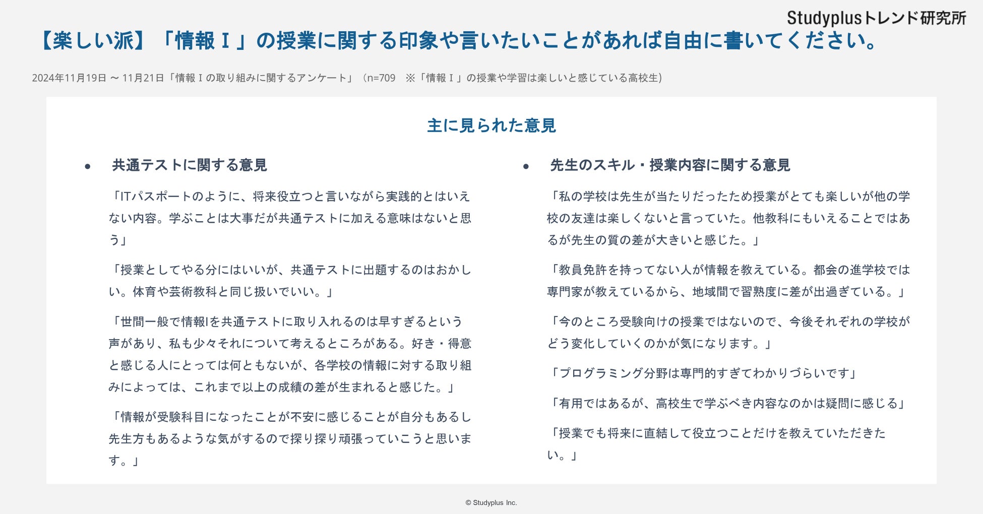 「情報Ⅰ」に対しての印象や提言を自由回答で求めたところ、授業や学習が「楽しい」と回答した人も「楽しくない」と回答した人も、共通テストの受験科目として追加されたことに対しての疑問を強く感じている点は共通しています。また、先生の教え方にばらつきがあること、期待している授業内容ではないことなども課題として抱いているようです。