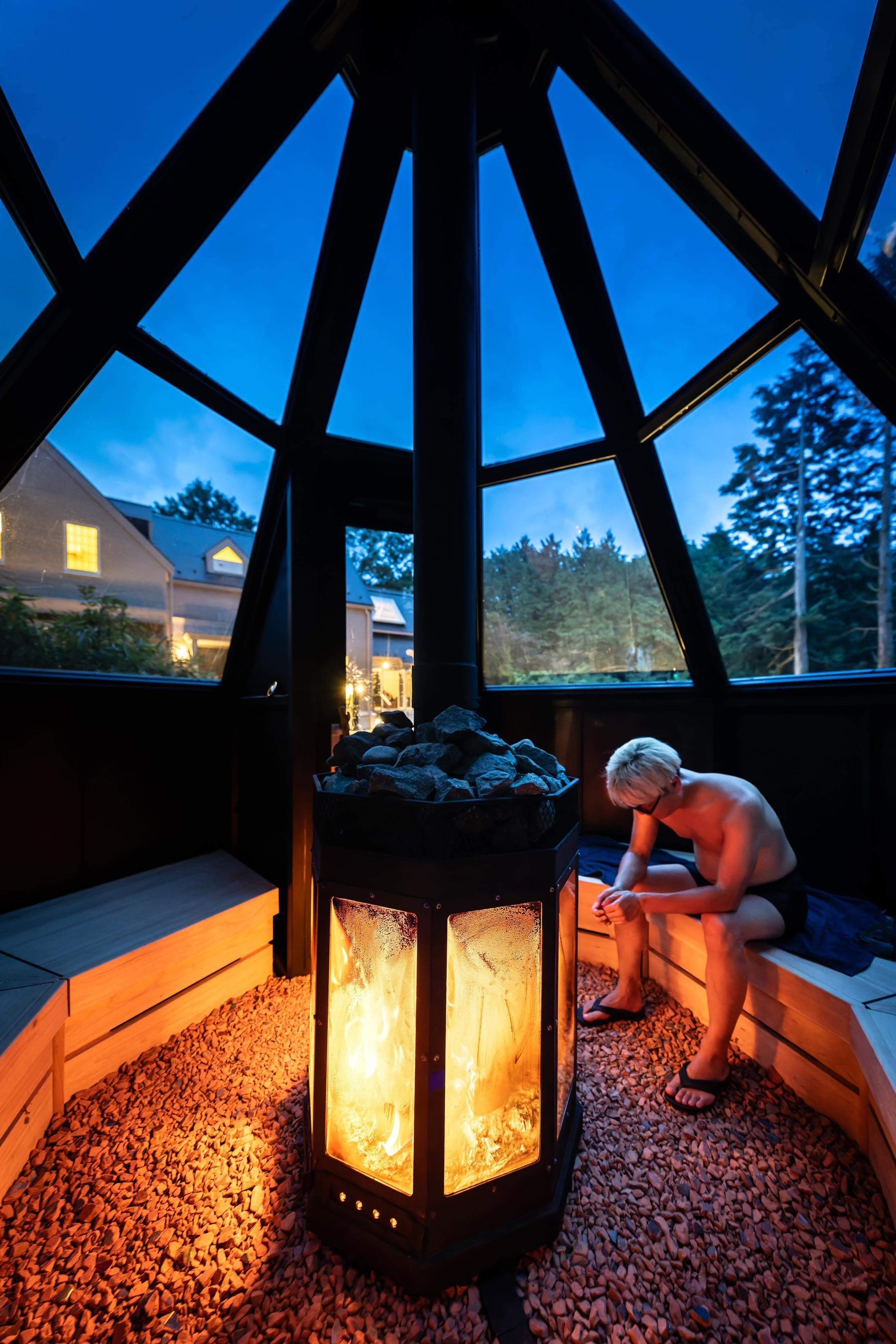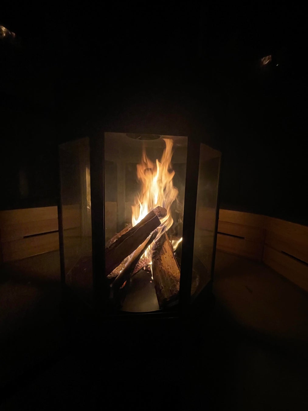 キャンプモードは、サウナ室のほぼ中心に置かれた焚き火のように炎を囲みながらサウナを楽しむ方法です。