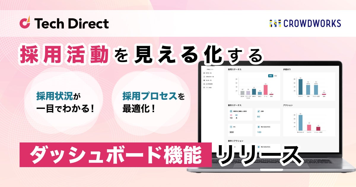 フリーランス業界最大級プラットフォーム(登録ワーカー680万人・登録企業100万社)を基盤に、IT人材&DXコンサルティングサービスを提供する株式会社クラウドワークス(本社:東京都渋谷区 代表取締役社長 兼 CEO:吉田 浩一郎 以下「当社」)が運営するハイスキルIT人材マッチングサービス「テックダイレクト」は、採用データの重要指標をリアルタイムでグラフ化し、採用プロセスを最適化するダッシュボード機能(以下、新機能)を提供開始いたしました。