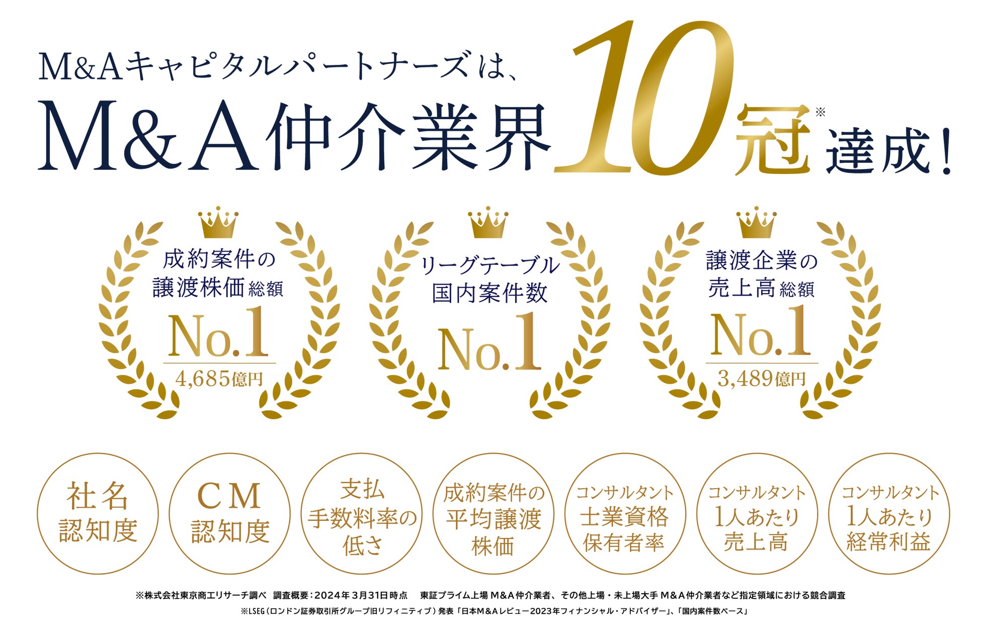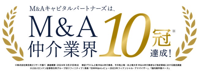 M&Aキャピタルパートナーズ株式会社(東京都中央区・代表取締役社長 中村 悟) は、株式会社東京商工リサーチ(東京都千代田区・代表取締役社長 河原光雄)が2024年3月に実施したM&A仲介業界における調査において、前回の調査でNo.1を獲得した部門などで業界No.1となり、LSEGが発表したM&A市場リーグテーブルを含め、M&A仲介業界における主要10部門で業界No.1を獲得したことをお知らせします。