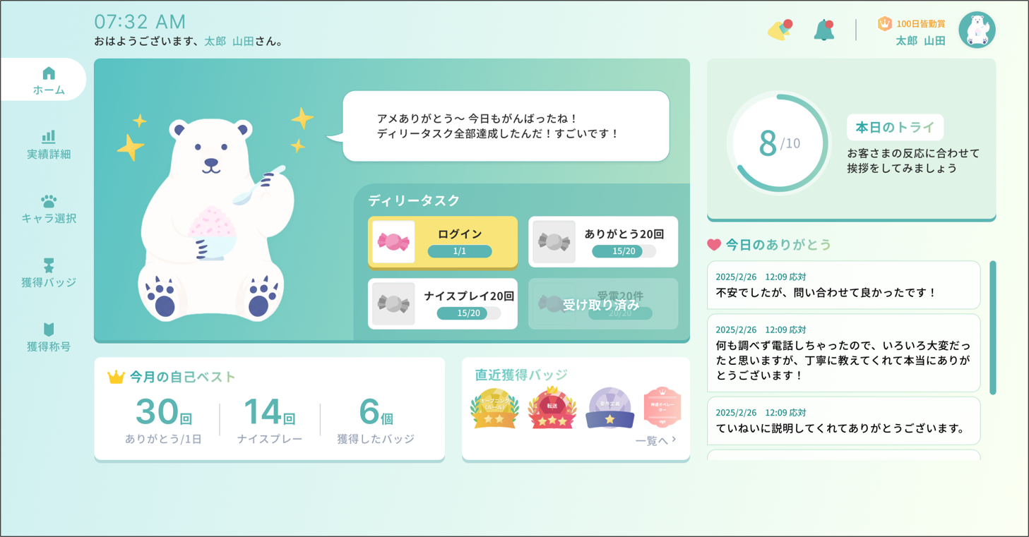 また、オペレーターは、選択したキャラクターから、応対内容に対するフィードバックを受けるほか、評価に応じたキャラクターの獲得など、ゲーム性も取り入れることで、楽しみながらオペレーターの応対品質向上とモチベーション向上を支援いたします。