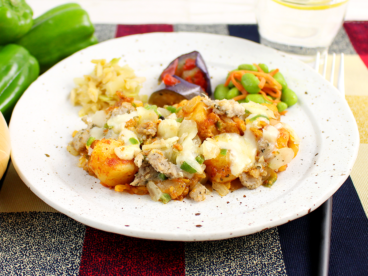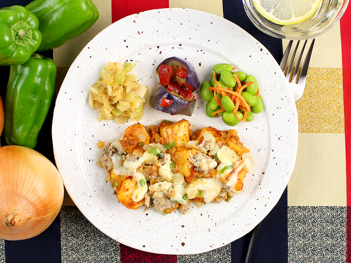 胡椒の効いたサルシッチャとピリ辛アラビアータソースをニョッキと合わせました。ニョッキとは、お団子のようなもっちりとした食感が魅力のパスタの一種です。トマトケチャップを隠し味に入れており、辛さの中にも甘味を感じる奥深い仕上がりになっています。ピーマン、チーズ、玉葱を添えております。副菜は、ハニーマスタードで調味したキャベツとレンコンソテー、鶏がら風味の揚げ茄子のペッパーマリネ、さっぱりと塩と胡椒で和えた枝豆と人参サラダです。
