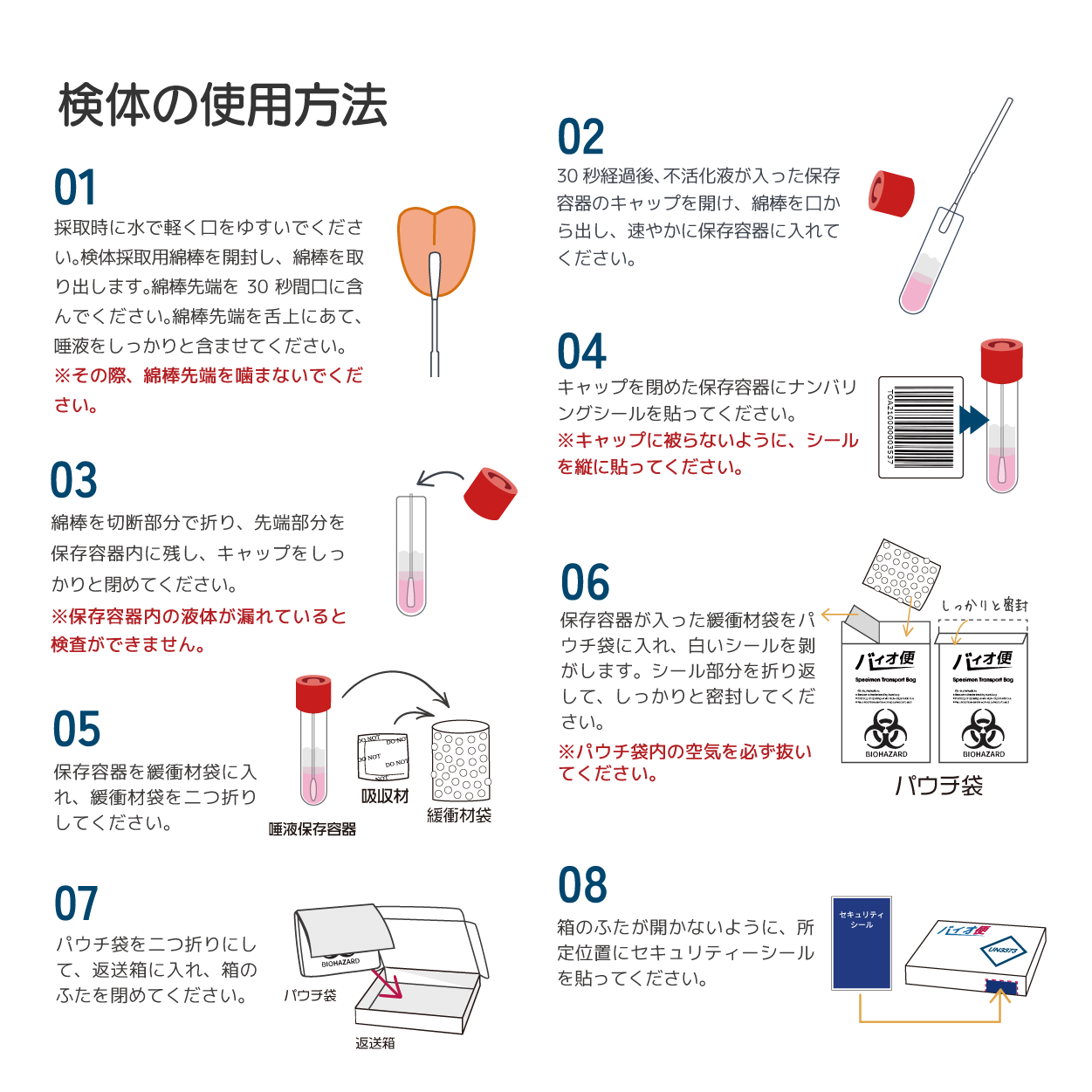 ③説明書の手順の通り唾液を採取し、唾液採取したスワブを保存容器へ入れ、キャップを閉める。