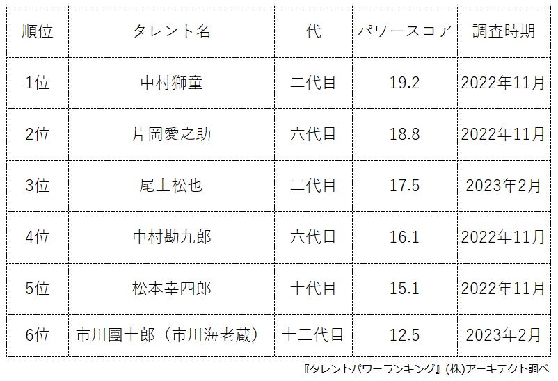 『タレントパワーランキング』では、タレントパワーランキングに登録されている俳優としても活躍している歌舞伎役者のパワースコアを調査。