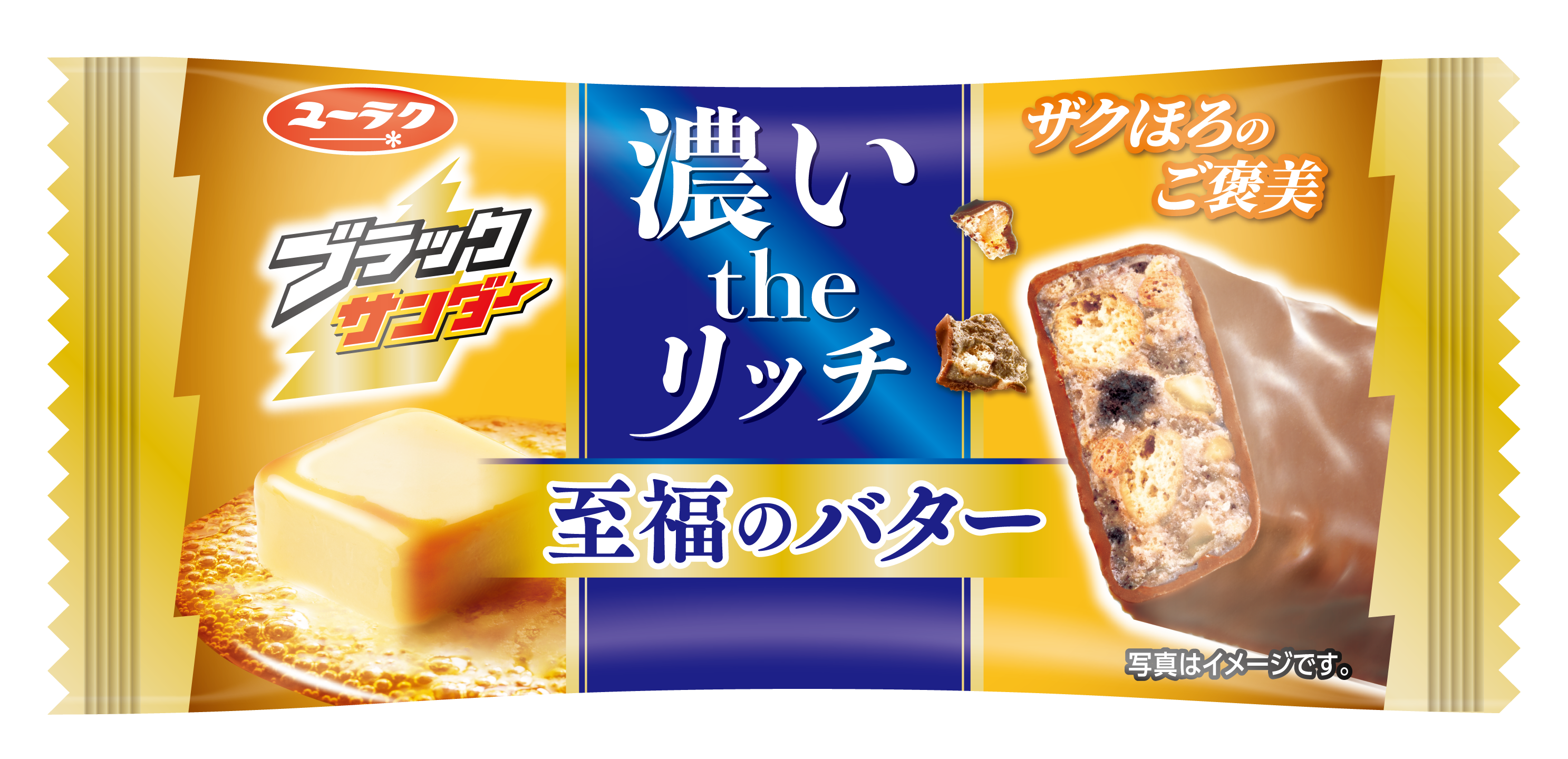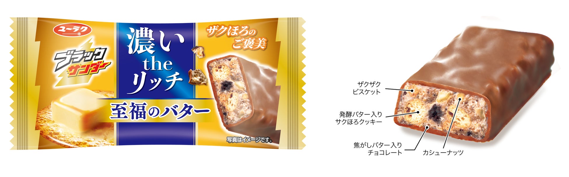 ブラックサンダー至福のバターは発酵バター入りサクほろバタークッキーとザクザクビスケットに焦がしバター香るチョコレートを使用。クセになるザクほろ食感とバターが生み出す「濃いtheリッチ」な味わいをお楽しみください。
