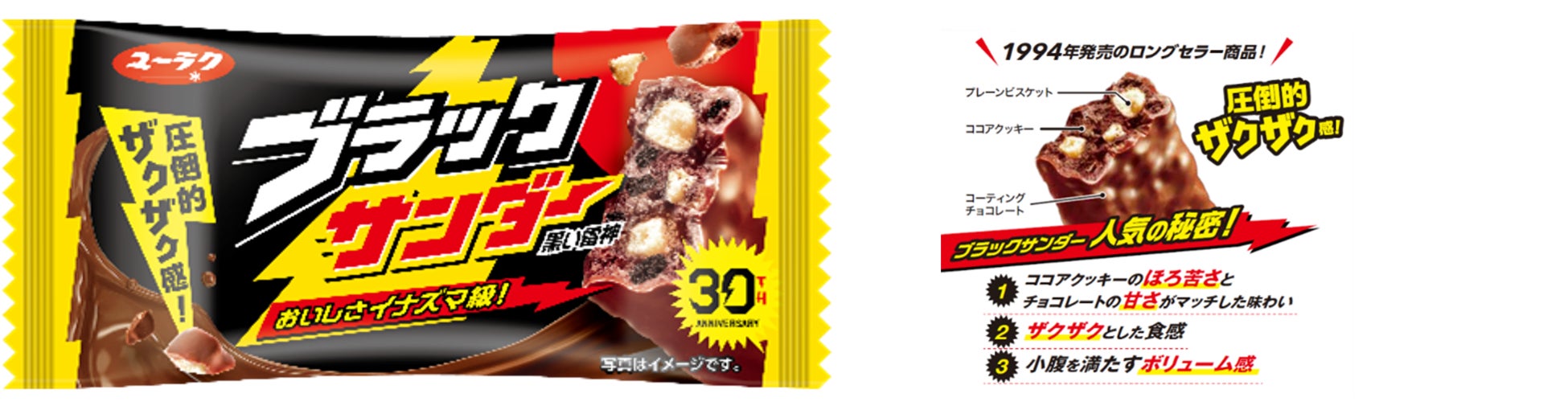 ブラックサンダーは1994年に誕生したチョコレートバーです。2024年9月に30周年を迎え、ブラックサンダーの特長である「圧倒的ザクザク感!」がパワーアップ!従来のココアクッキーをよりハード食感にした新しいココアクッキーを配合。食感の異なる2種のココアクッキーとプレーンビスケットが生み出す進化した「圧倒的ザクザク感!」をお楽しみください。