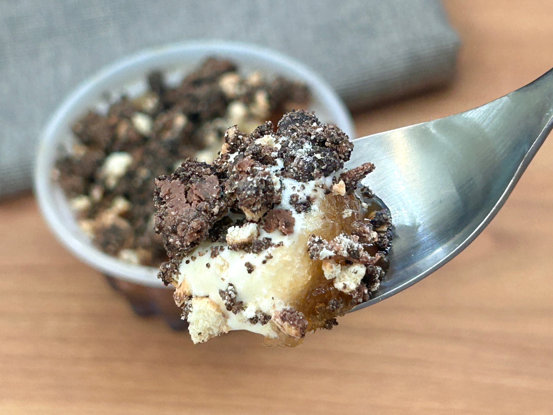 ①ブラックサンダーを粗めに砕き、ギリシャヨーグルトに入れてかき混ぜる。