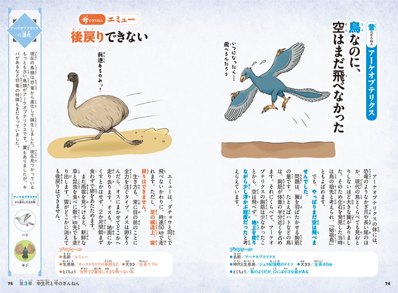 昔のいきものとその子孫にあたったりあたらなかったりする今のいきものの、ざんねんを見開きで比較できます。