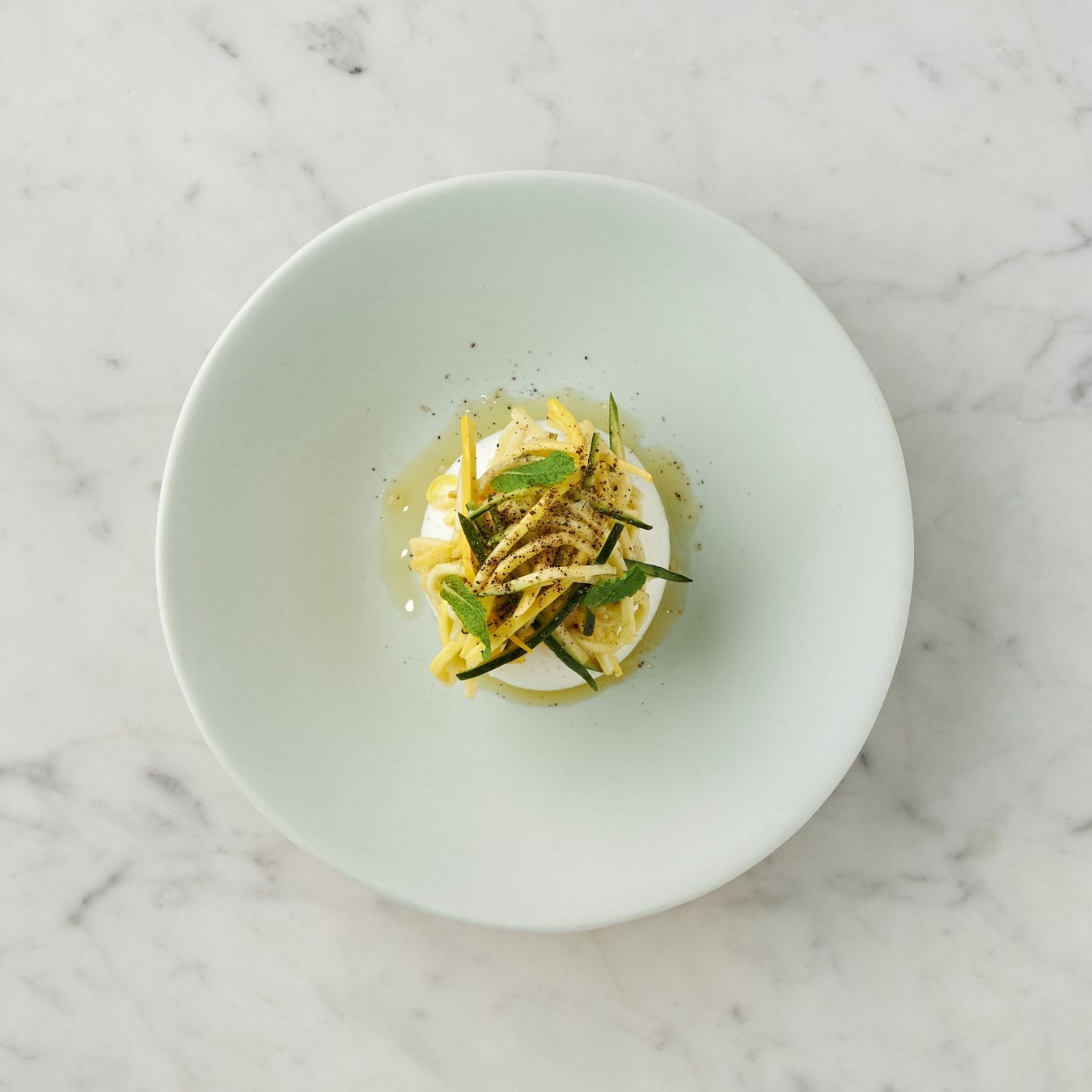人気の“ブラティーナ”と夏野菜ズッキーニを合わせました。暑い季節でもさっぱりと召し上がれます。夏らしい爽やかな色彩も魅力です。