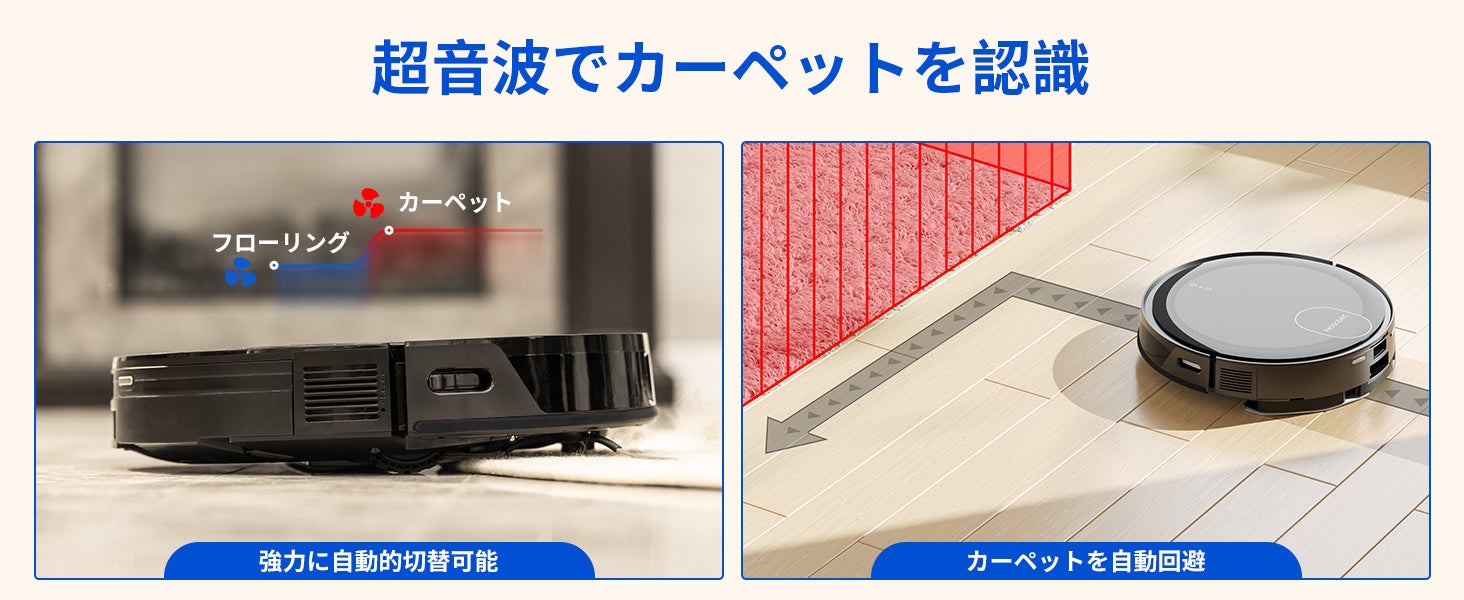 5.超音波でカーペットを認識、水拭き中でも、カーペットを濡らさない