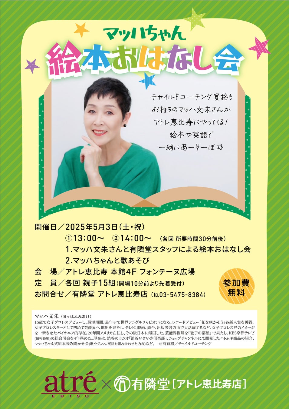 15歳で女子プロレス最年少世界王者、歌手・タレントとしても活躍し、20年の米国生活を経て、芸能界復帰後も幅広く活躍中で「チャイルドコーチング資格」もお持ちの「マッハ文朱(ふみあけ)さん」がアトレ恵比寿にやってきます。資格を活かした絵本おはなし会や歌あそびイベントを開催します。