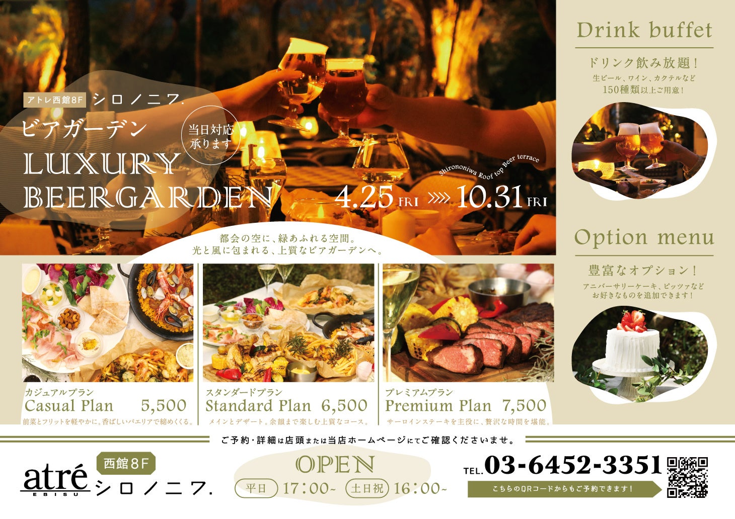 4月25日(金)より、西館8階「シロノニワ」では『Luxury Beergarden』をテーマにしたビアガーデンがスタート。お子様連れでもくつろげる光と緑に囲まれた開放感溢れる絶景のテラスで、自然の恵みを活かした料理をお楽しみください。初日にはオープニングイベントも開催します。