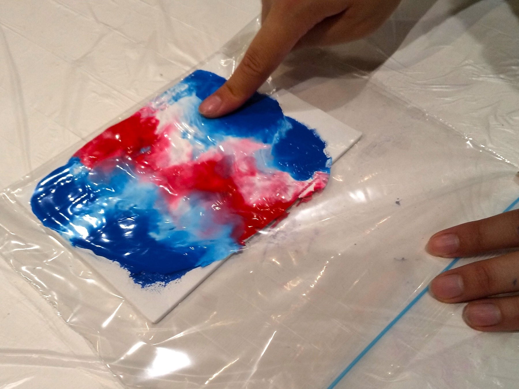 手を汚さず、小さいお子様が絵具の感触を楽しむアート活動ができる、親子で参加可能なアクティビティです。