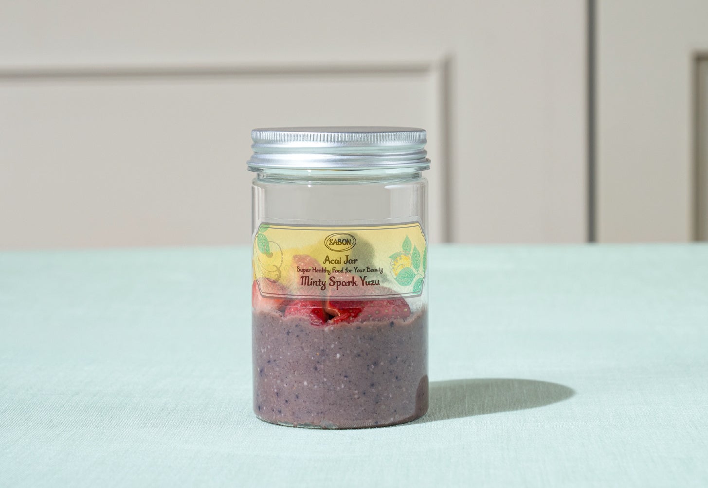 たっぷりのフルーツやグラノーラとともに、SABONのボディスクラブを模したガラスジャーで提供いたします。