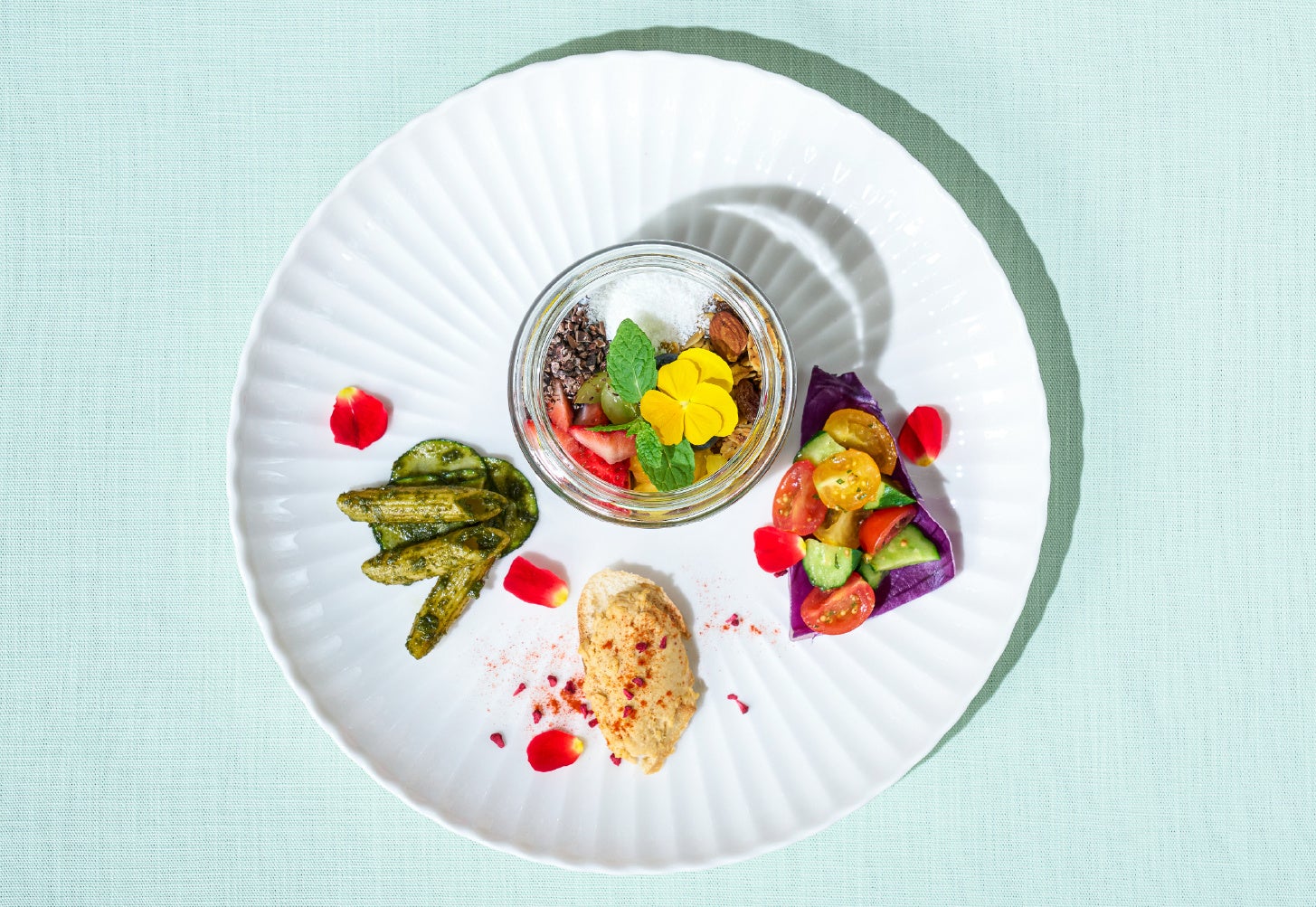 夏季限定「ミンティスパーク・ユズ コレクション」を構成するミントやユズをはじめとして、さまざまな新鮮素材を豊富に使った、プラントベースのスペシャルプレートとオリジナルドリンク。