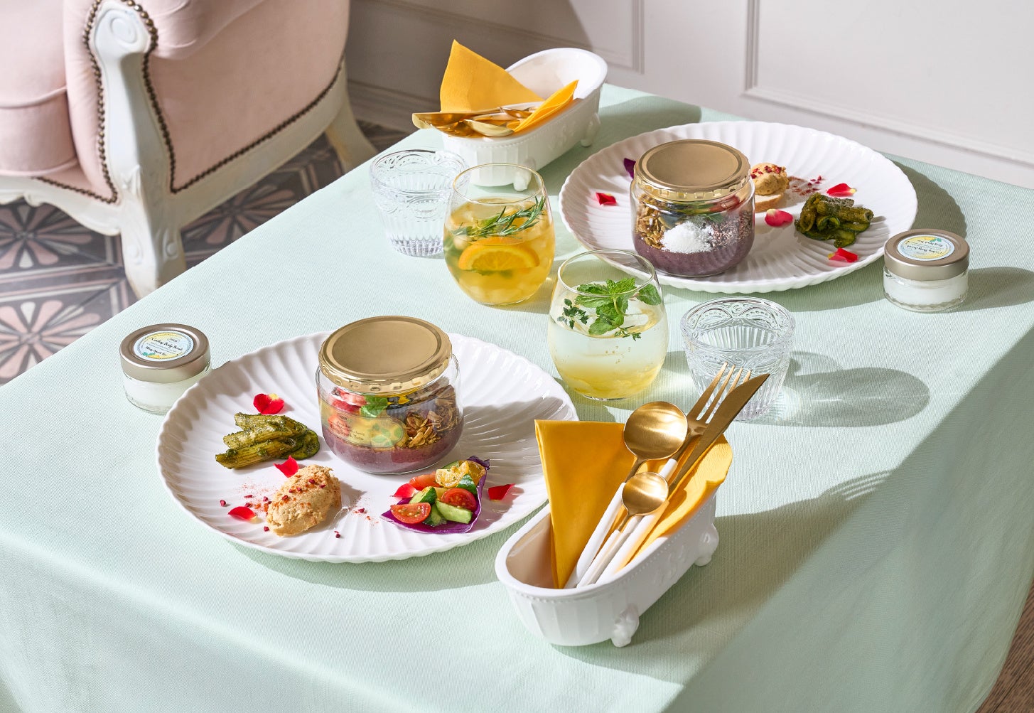 「ズッキーニとペンネのジェノベーゼ」、「フムスとドライラズベリーのカナッペ」、「きゅうりとトマトのユズ風味マリネ」など、いずれも植物性素材のみで創りあげた、感性と好奇心を満たすオリジナルメニューです。