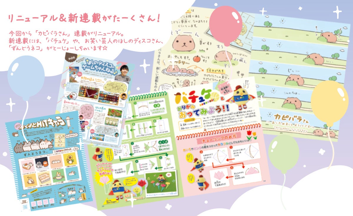 そして、今回から「カピバラさん」連載がリニューアル。新連載には、「バチュケ」や、お笑い芸人のほしのディスコさん、「ずんどうネコ」がとーじょーしちゃいます☆☆☆