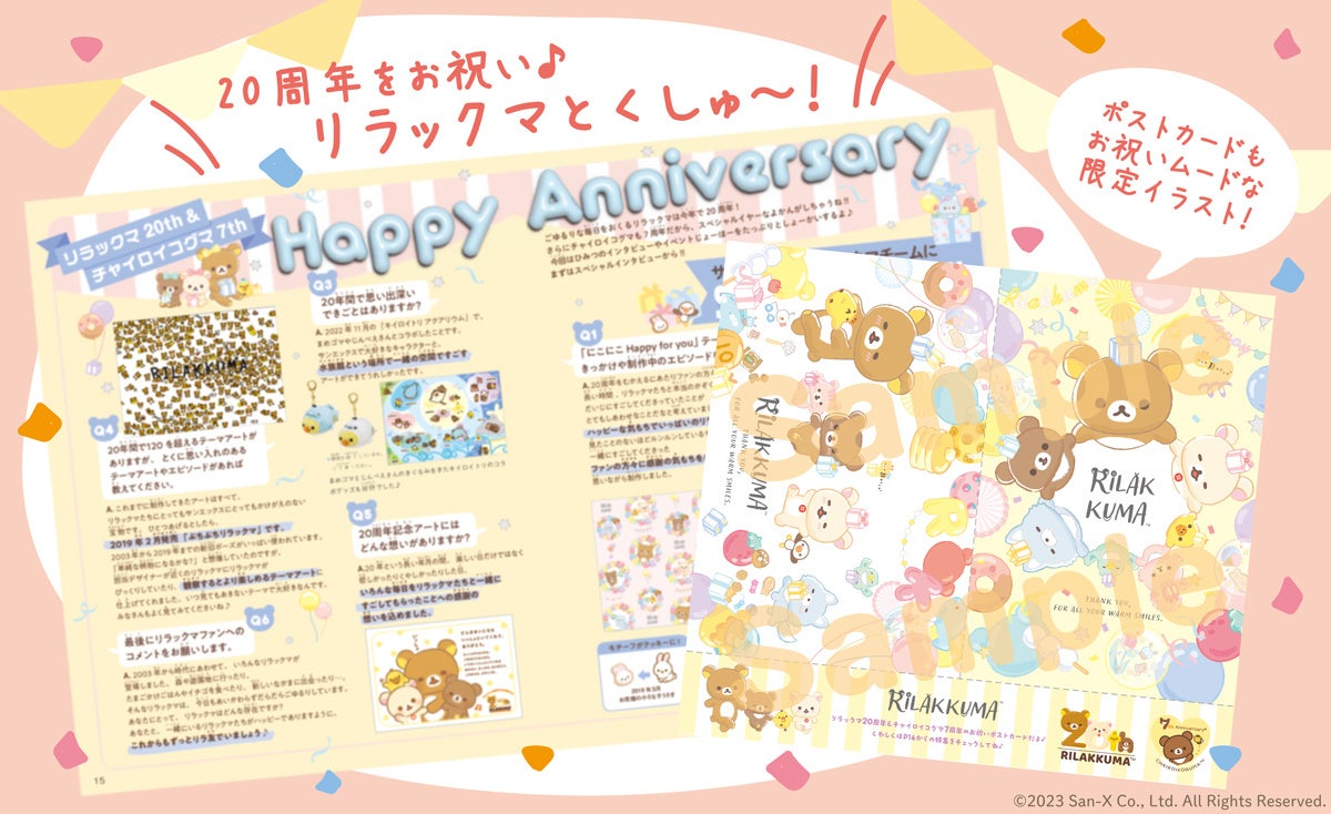 今年で20周年をむかえる「リラックマ」のとくしゅーは絶対にみのがせない~! 過去の人気テーマイラストの紹介や、イベントNEWSのほかに、なななんと、ねーねー独占取材!? サンエックス・リラックマチームへのインタビューもあるよ!! 今回はポストカードもお祝いムードいっぱいの「にこにこHappy for you」テーマでおとどけします♪