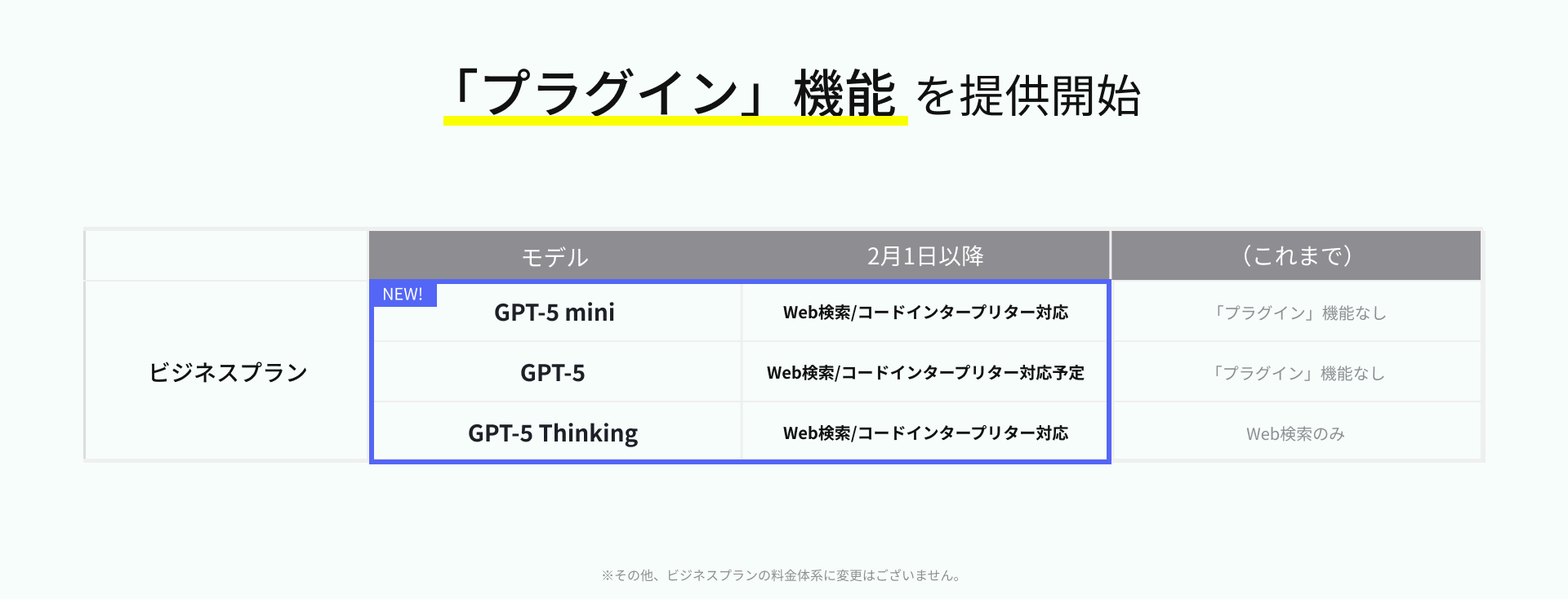 ※これまで提供していた「Webブラウジング」等の単機能モデルは、今後統合され、廃止されていく予定です。その他のモデル「Gemini」「Claude」に変更はございません。「コードインタープリター」のセッション料金につきましても、2月1日より無料化されます(詳細は別途リリースをご参照ください)。