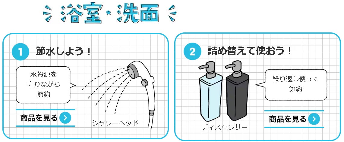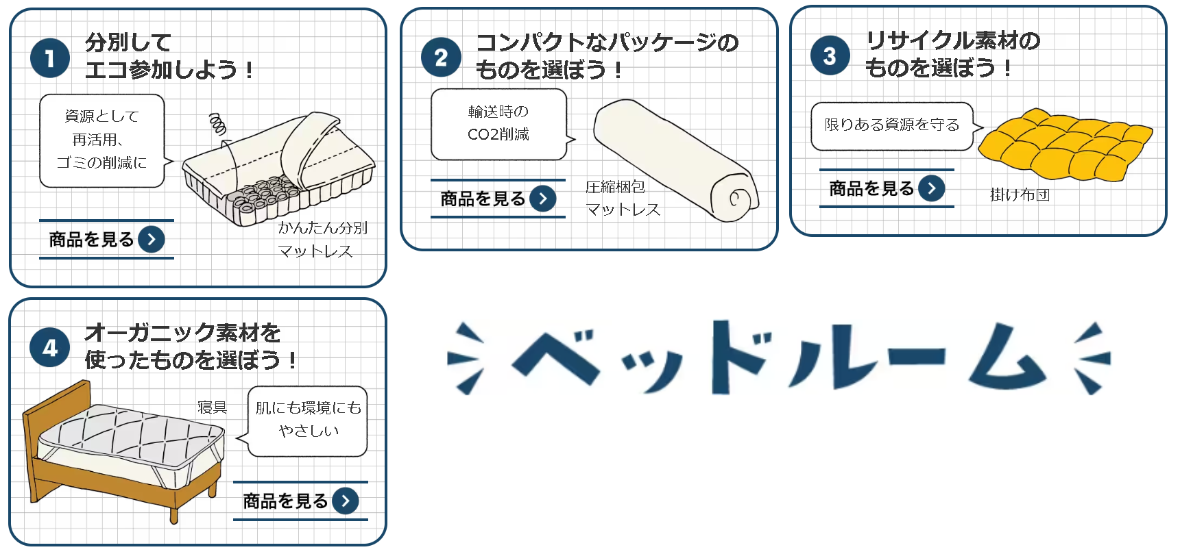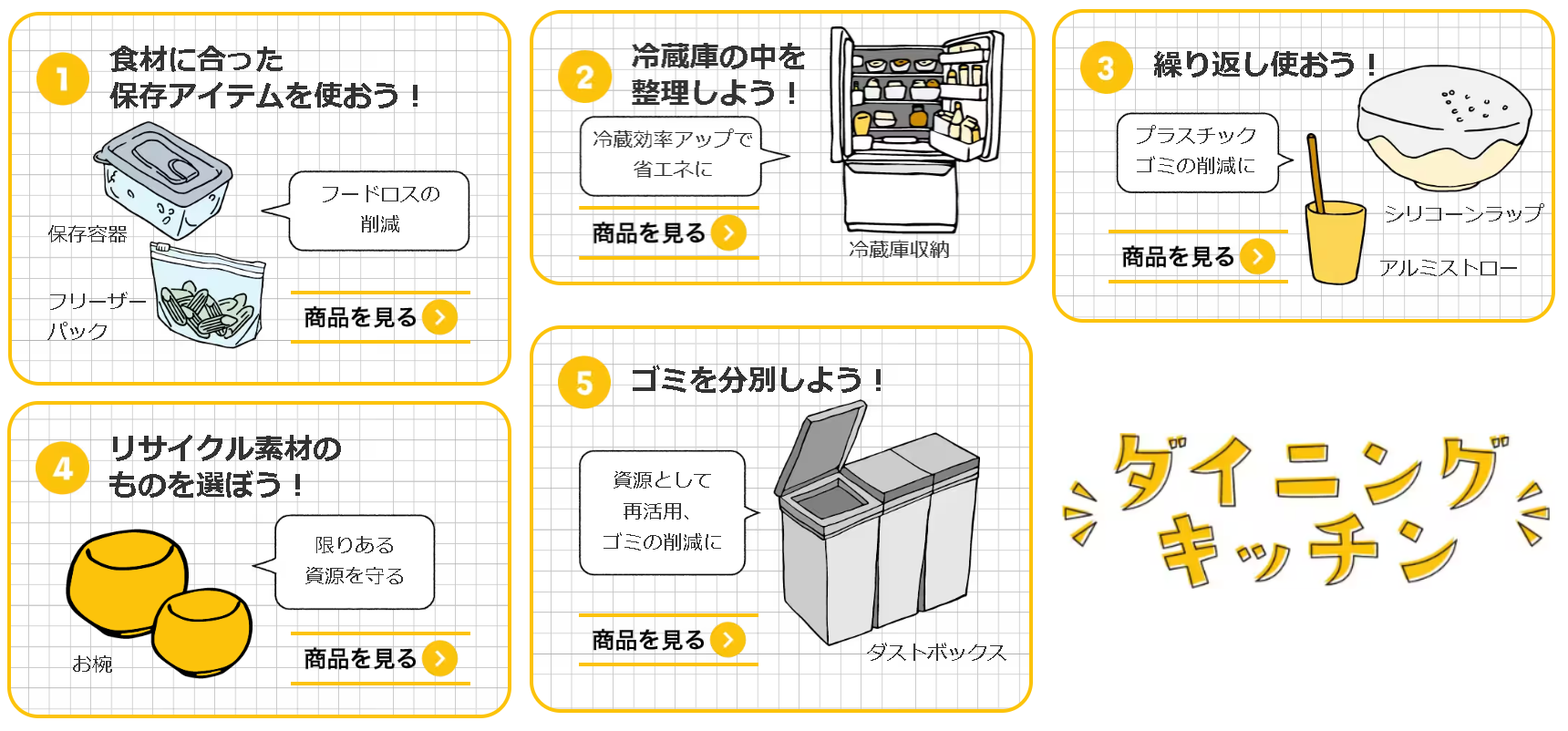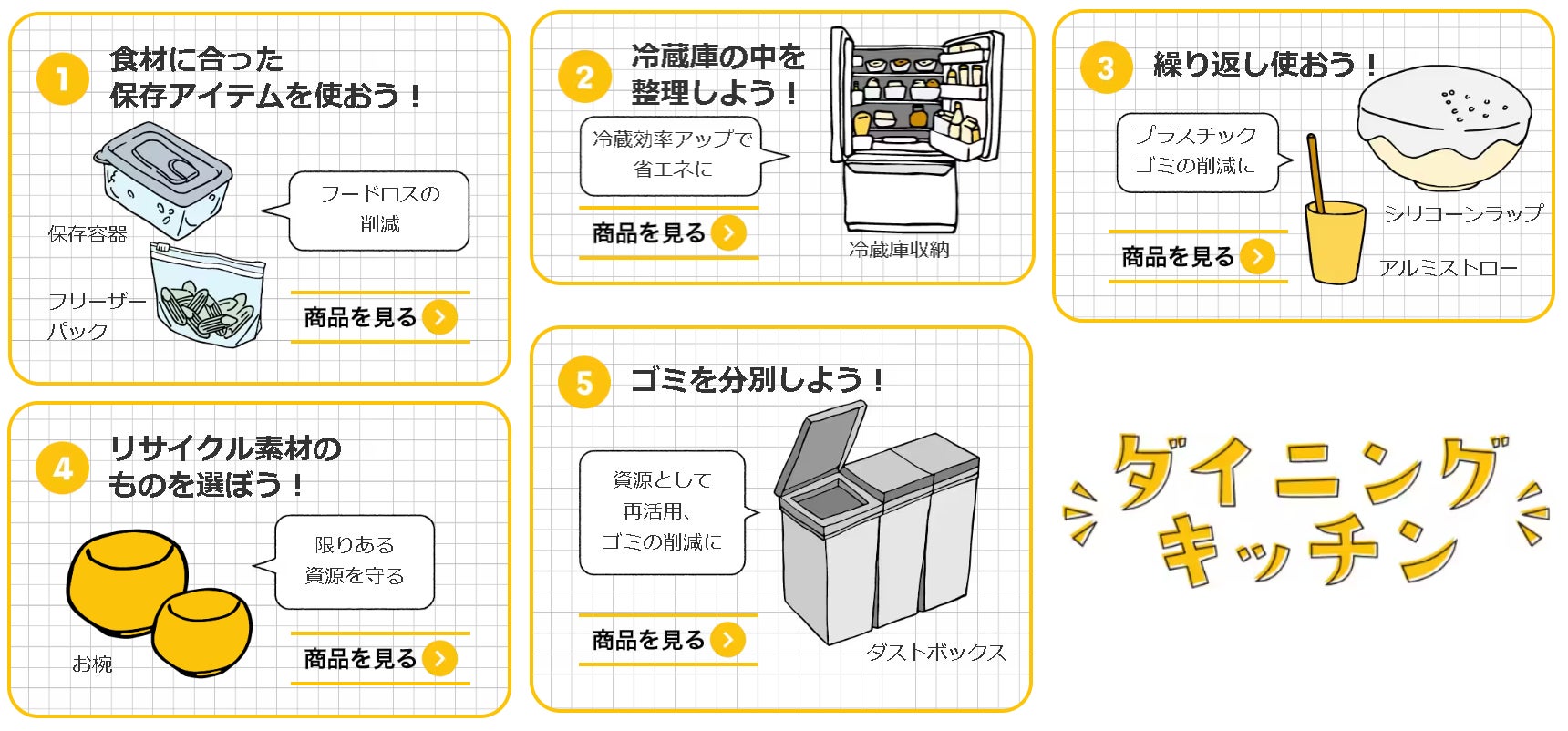 本特集では、「日々の暮らしがちょっとしたことでサステナブルに」をコンセプトに、新生活シーンに役立つ「環境にやさしい商品」約1,000アイテムを集約。気軽に楽しみながら選べるコンテンツを目指し、「リビング」「ダイニング・キッチン」「ベッドルーム」「浴室・洗面」「お出掛け」のシーン別に、イラストを用いながらご紹介しています。